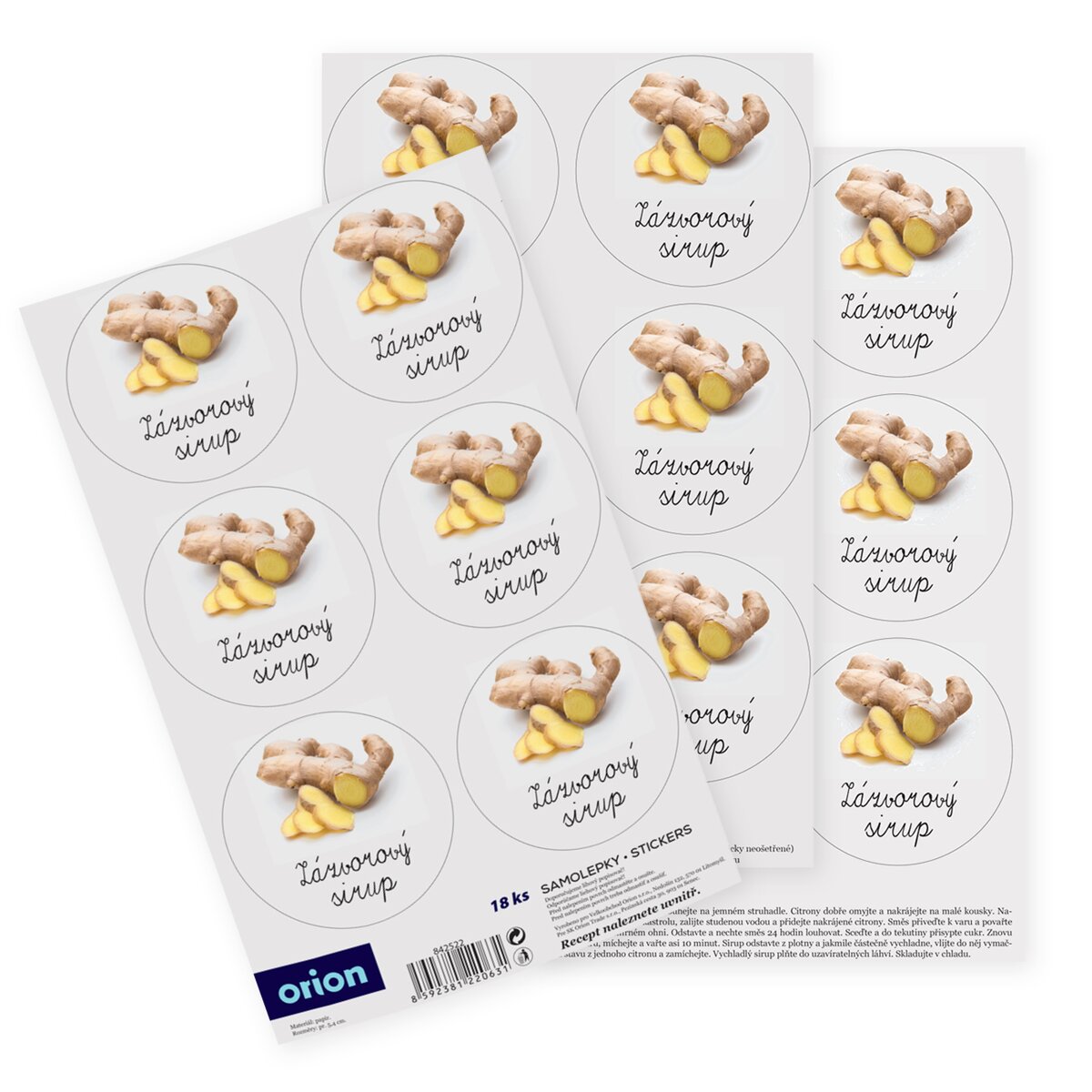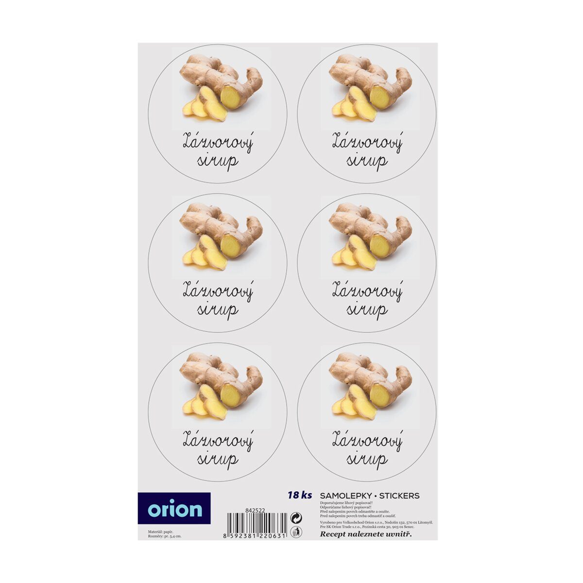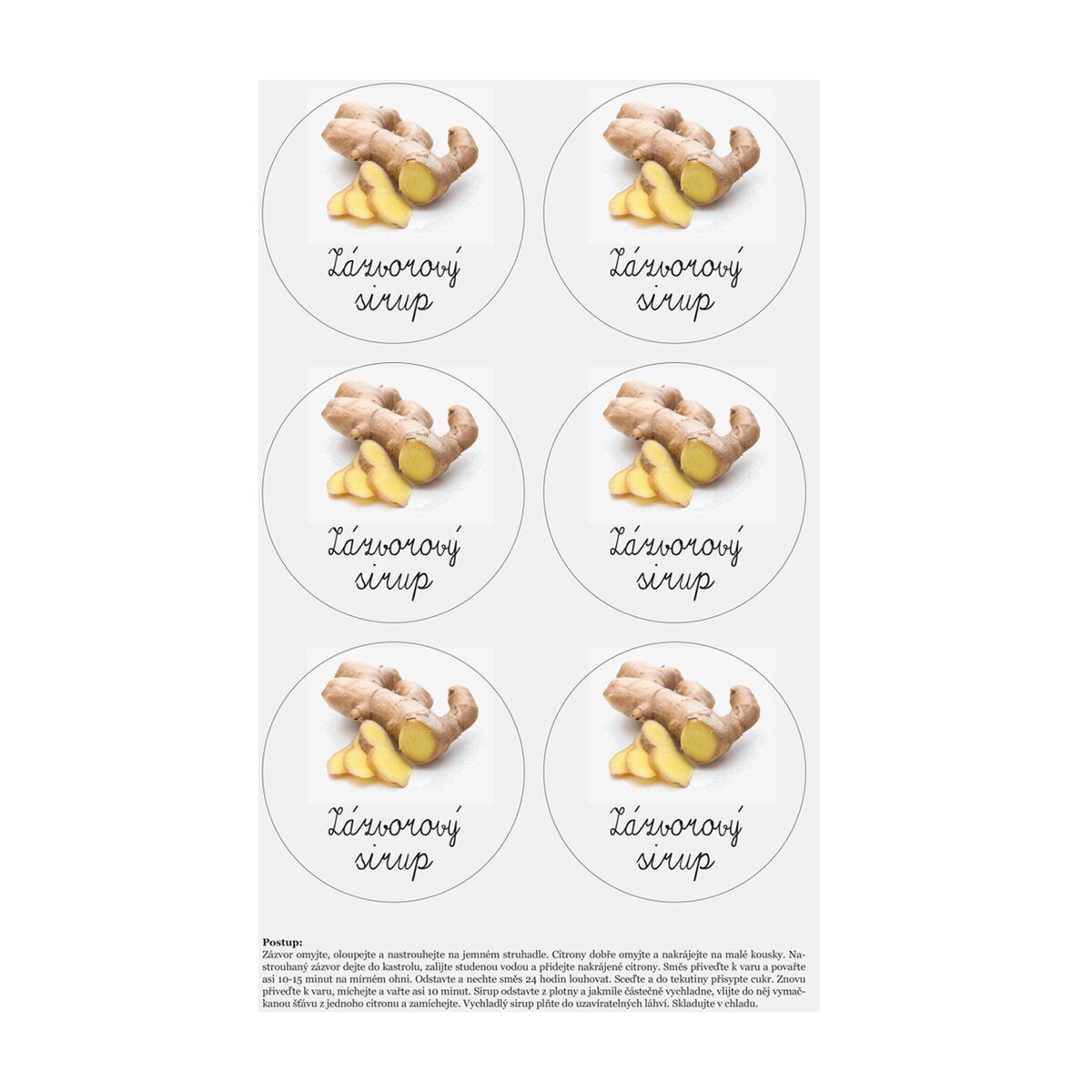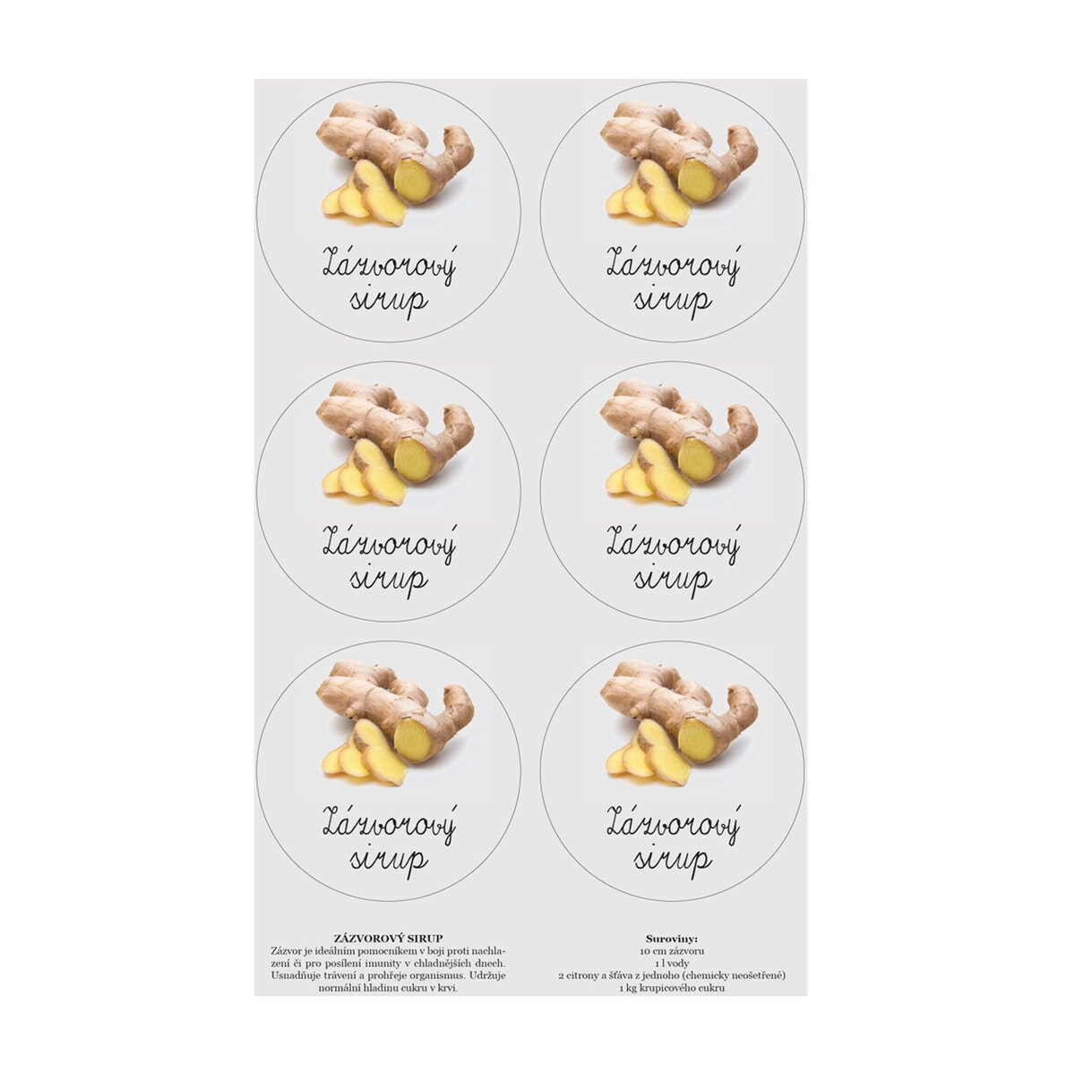Kód produktu 842522Sada 18 kusů papírových samolepek s obrázkem a popisem ZÁZVOROVÝ SIRUP. Průměr jedné kulaté samolepky je 5,4 cm.