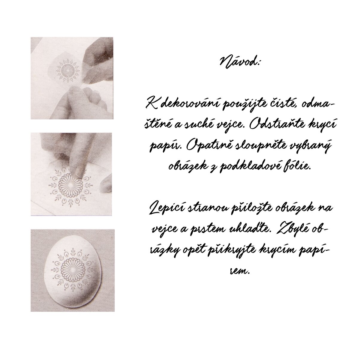 Výhodou je jejich velmi rychlá a jednoduchá aplikace – na suché a odmaštěné vajíčko přilepíte vybranou samolepku sloupnutou z podkladové fólie. Podrobný návod je přiložený ve fotogalerii.