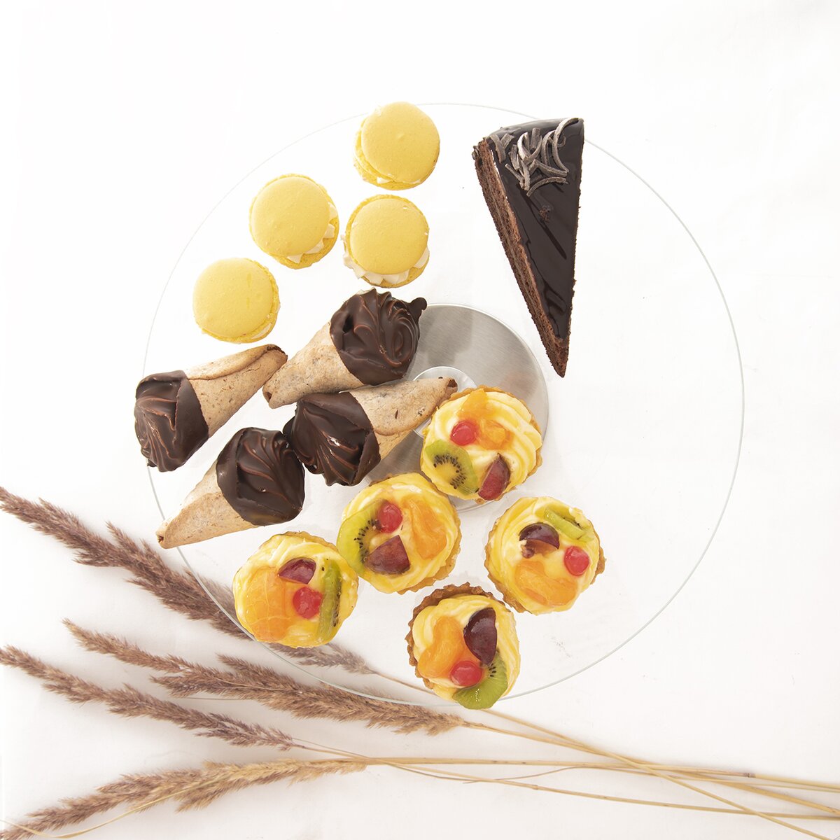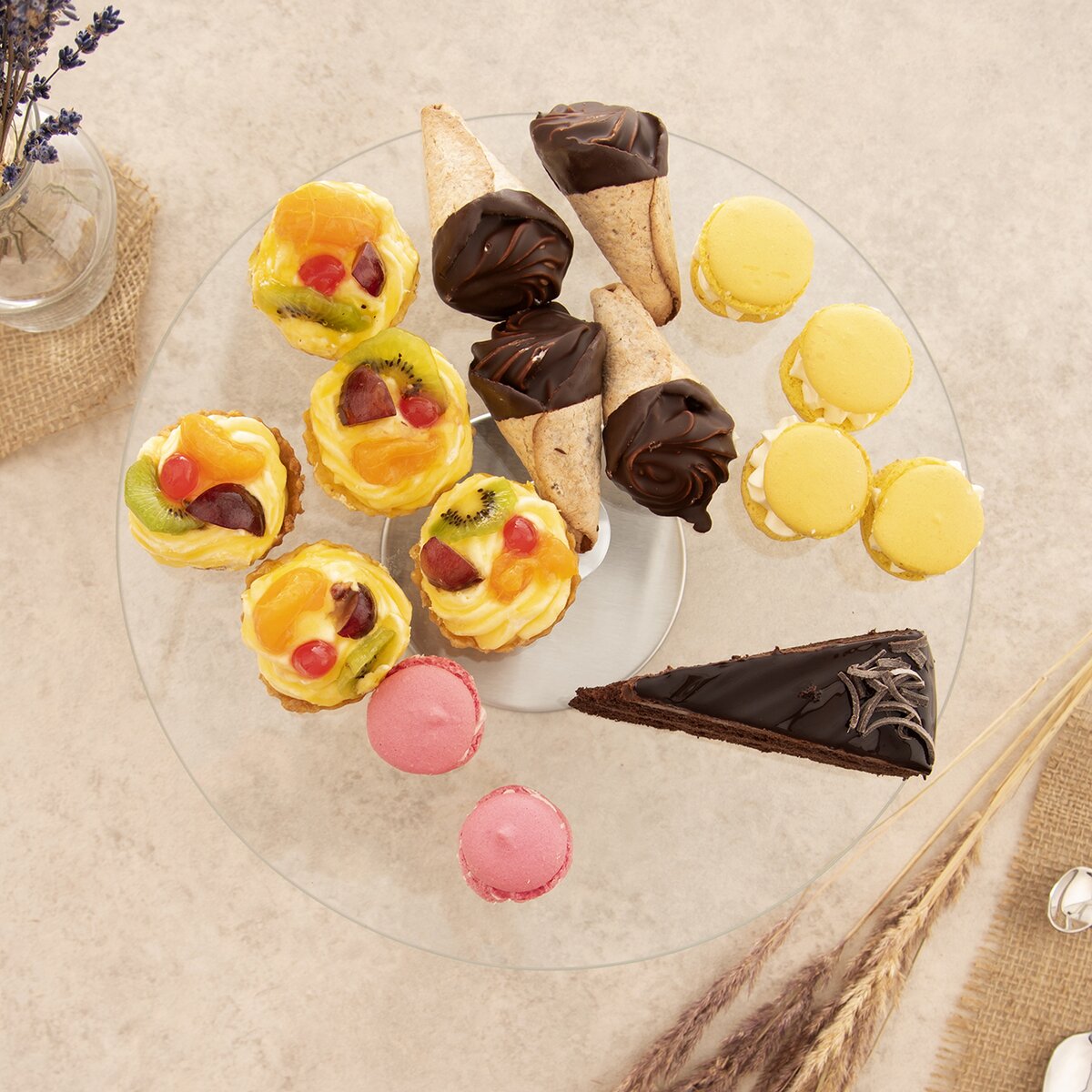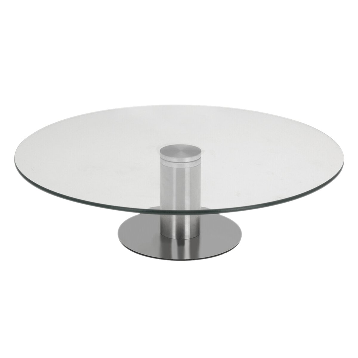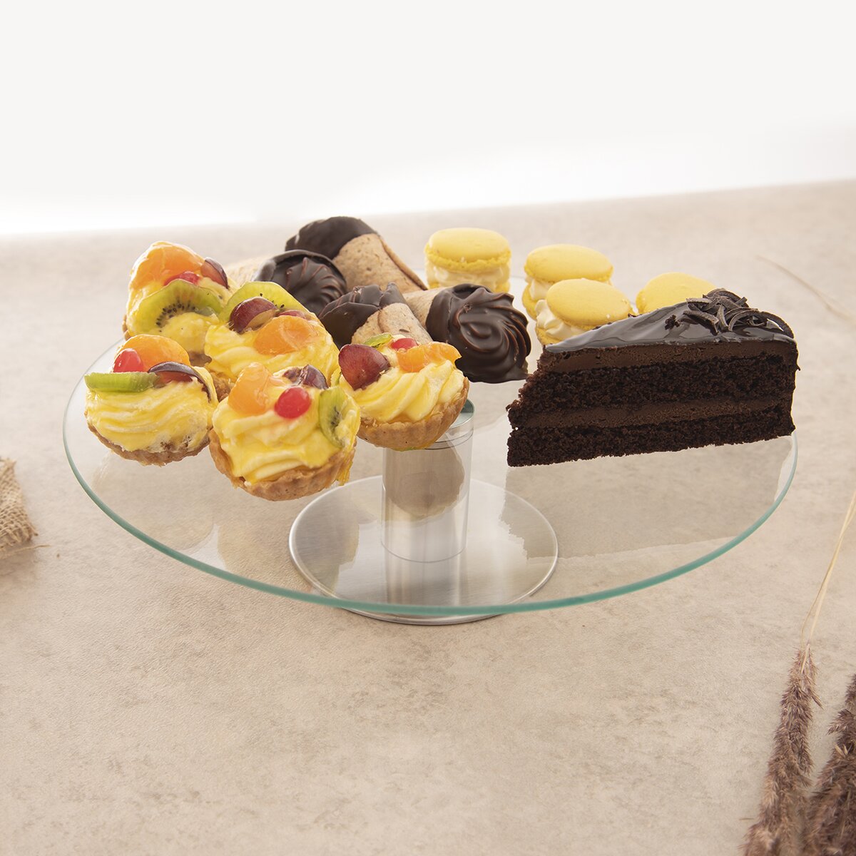 Kód produktu 122978Otočný skleněný stojan průměru 30 cm s nerezovým podstavcem pomůže stylově servírovat pizzu, zákusky i chlebíčky, pomůže s potahováním dortů a jejich zdobením.