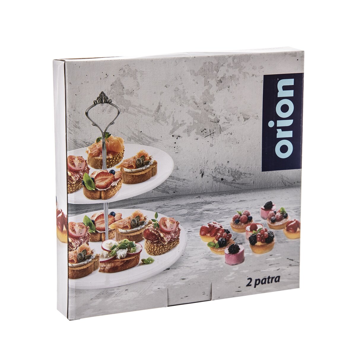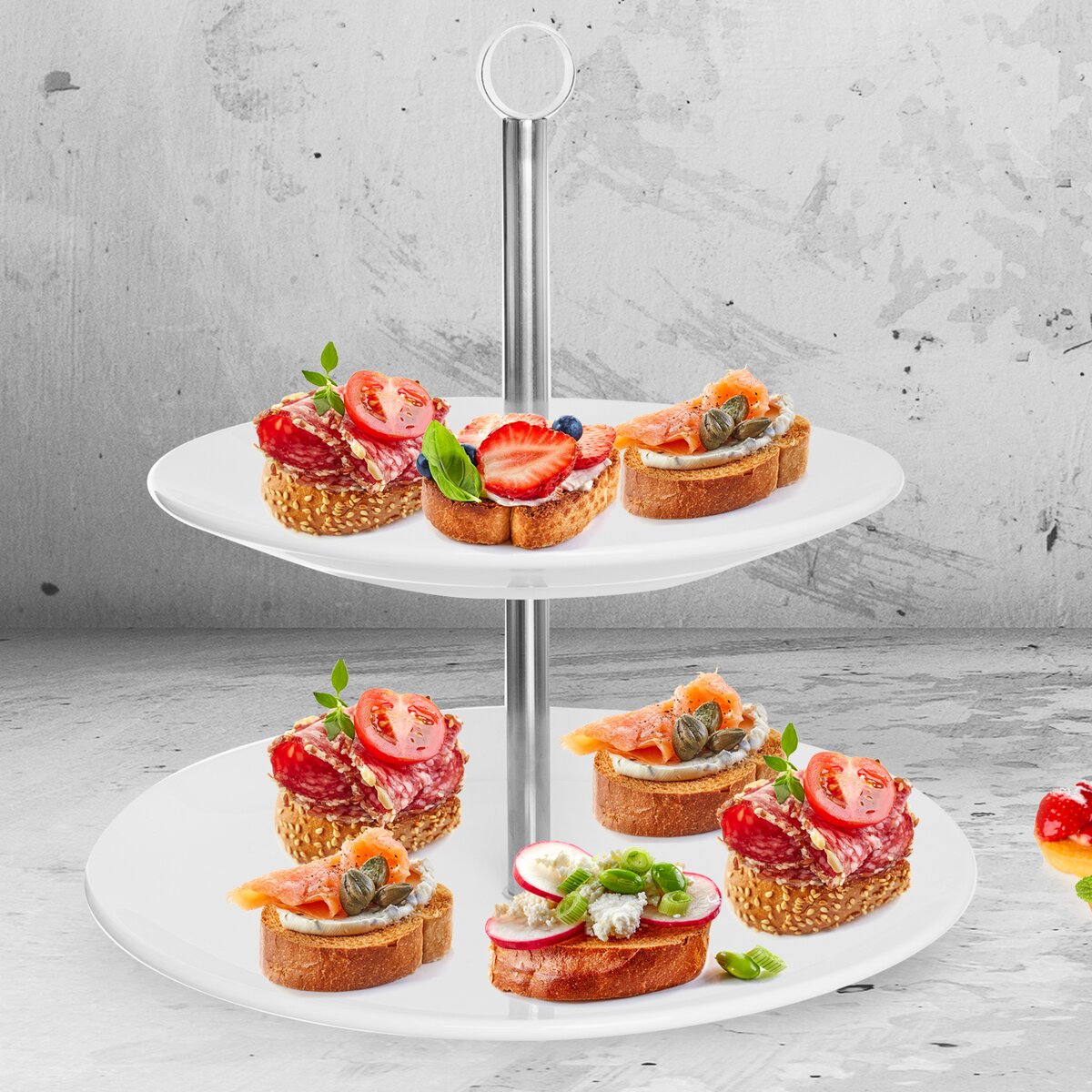Kód produktu 122963Dvoupatrový stojan určený k servírování dezertů a slaných pochutin. Součástí jsou kulaté porcelánové talíře, jejichž průměr je 20,5 cm a 25,5 cm.