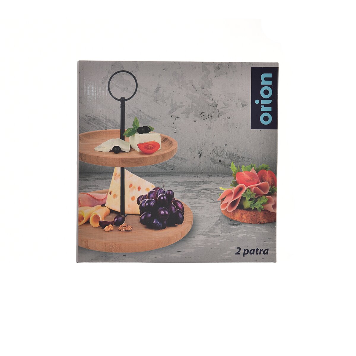 Jeho součástí jsou dva kulaté talíře z bambusového dřeva a kovový úchyt s kulatým zakončením, který usnadňuje jeho přenášení. Hodí se k servírování koláčů, cukroví, mini zákusků, chlebíčků či jednohubek.