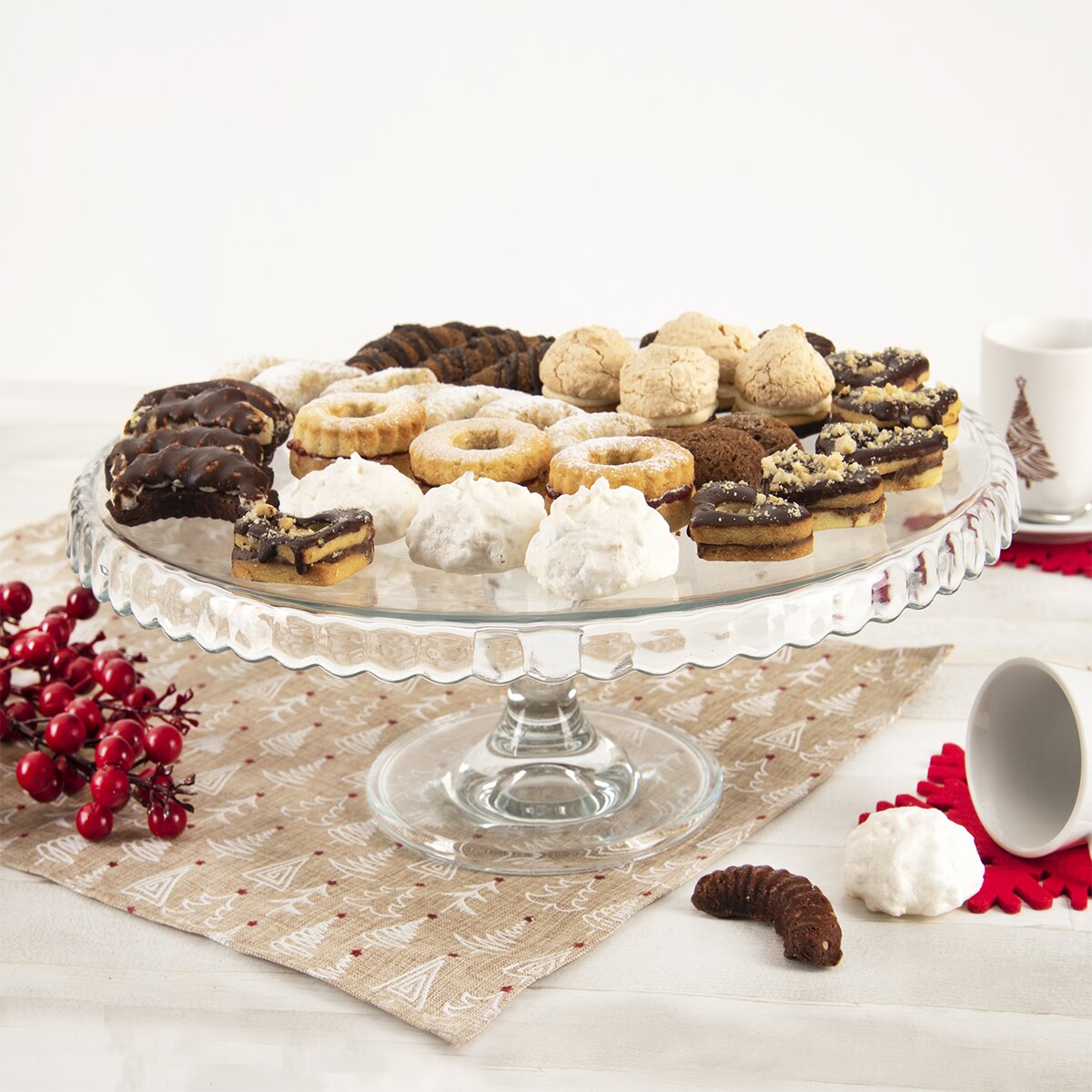Krásný skleněný podnos na nožce, který můžete využít k servírování koláče, dortu, bábovky nebo jiných dezertů. Na stole upoutá pozornost především jeho ozdobný vroubkovaný okraj zahnutý dolů, takže i jednotlivé řezy koláče, dortu snadno naberete lopatkou nebo nožem.