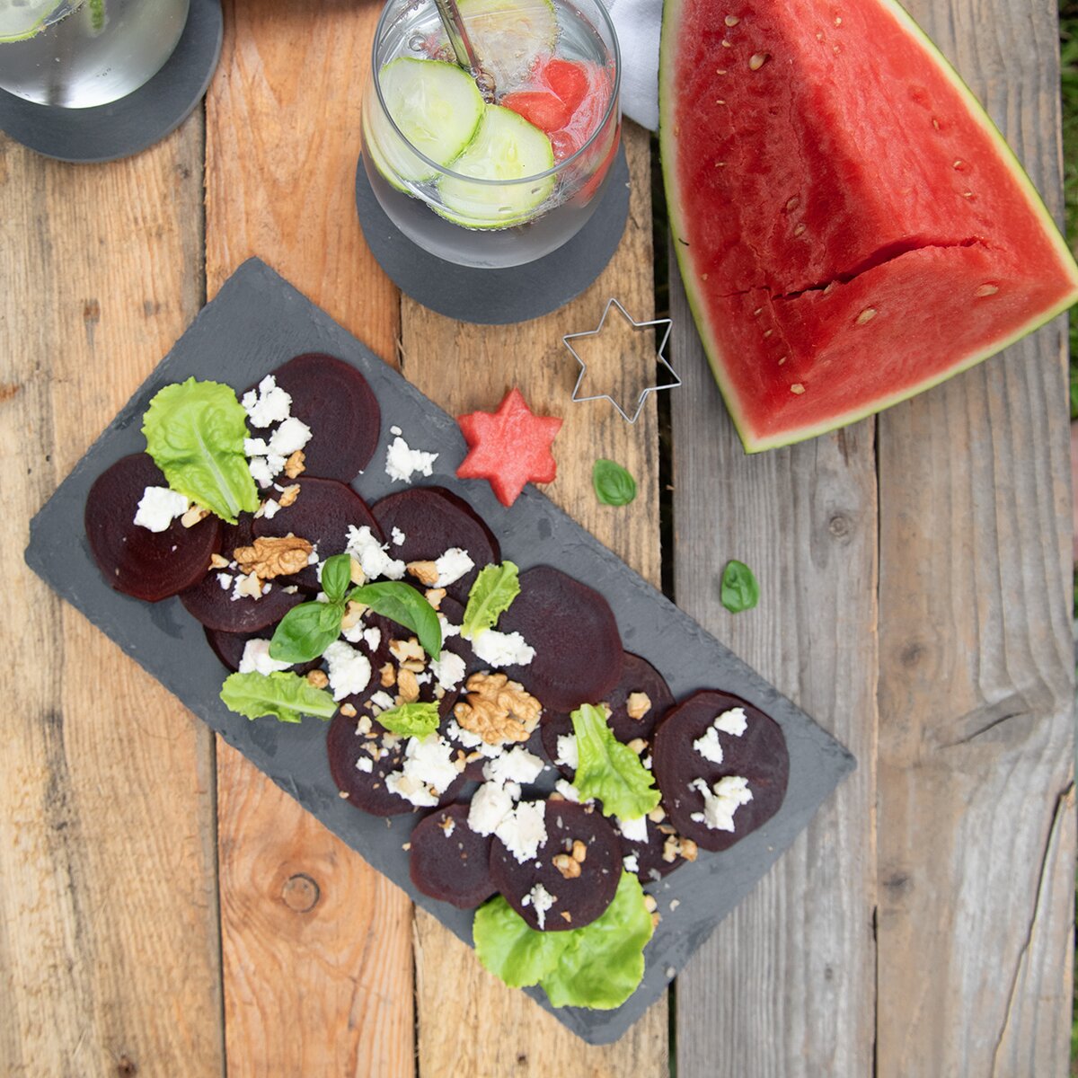 Díky materiálu, který je teď hodně trendy, bude břidlicová podložka výrazným prvkem při stolování, grilování nebo na narozeninovém či svatebním rautu. Navíc má zespodu protiskluzové podložky.