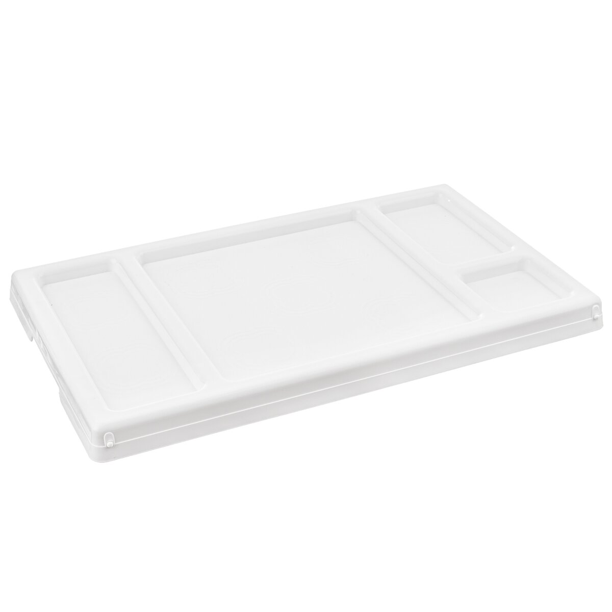 Kód produktu 153832Bílý plastový podnos do postele rozměru 50x30 cm se sklopnými nožkami a několika sektory, kam lze uložit odděleně pokrm, nápoje a jiné drobnosti.