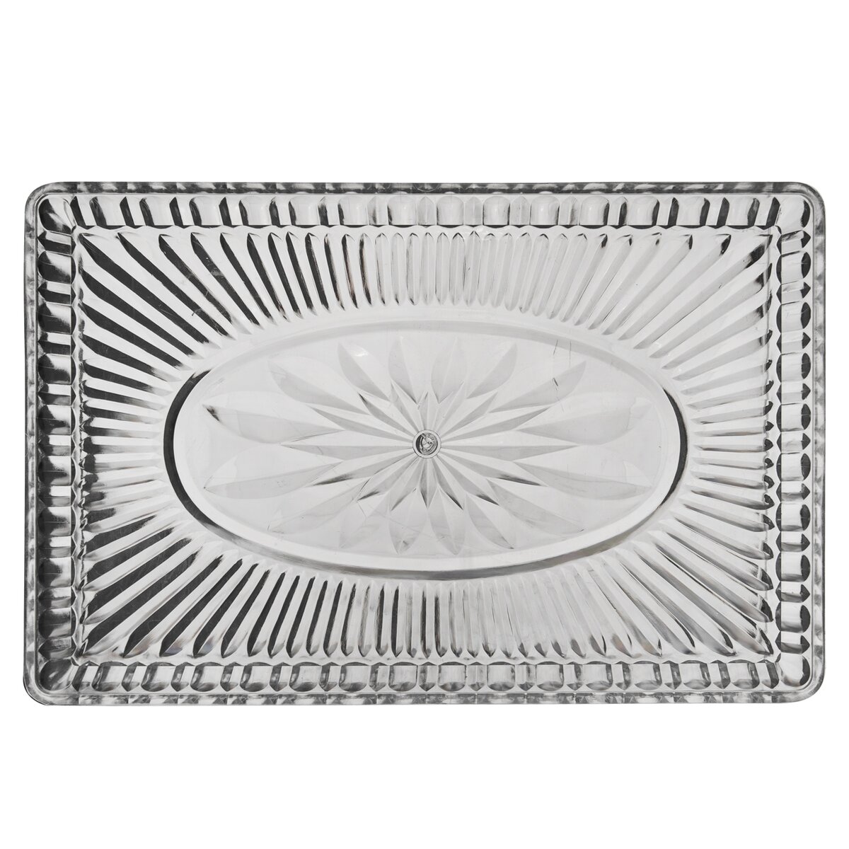 Kód produktu 153828Servírovací transparentní plastový tác o rozměru 33x21,5x2,5 cm, se specifickým protlačovaným vzorem.