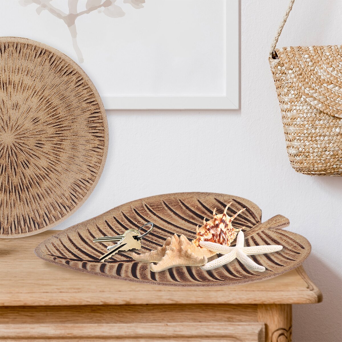 Tác z přírodního materiálu ve tvaru listu se zajímavou strukturou a s povrchovou úpravou ozdobí vaši domácnost. Využít ho můžete v kombinaci s dalšími přírodninami nebo jako servírovací tác. Vystouplý reliéf je ještě zvýrazněn tmavým tónováním.