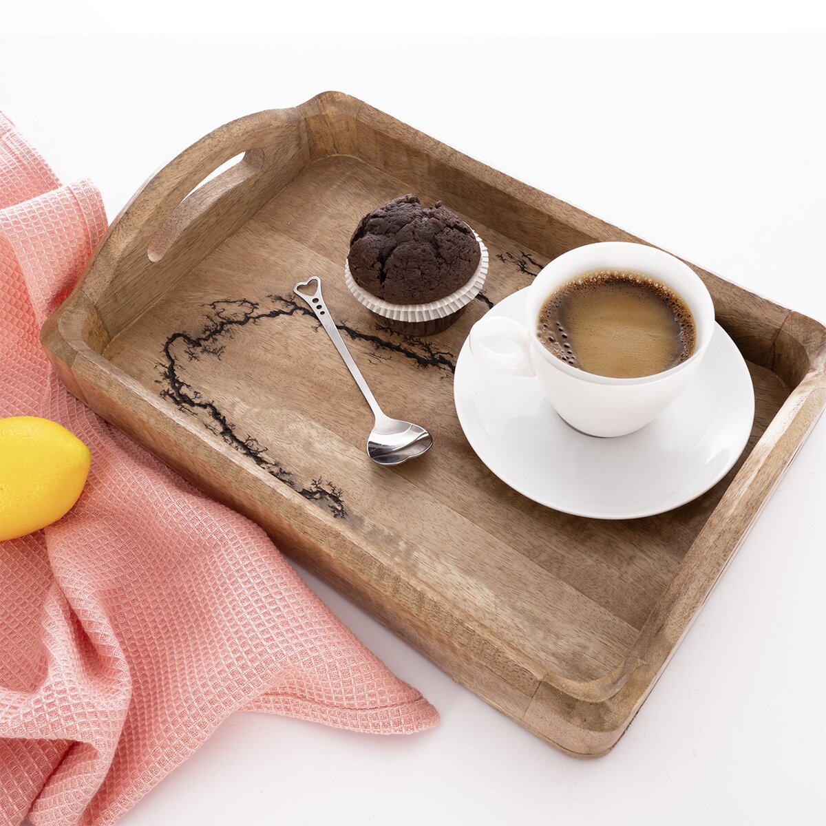 Elegantní a praktický tác z mangového dřeva vhodný pro servírování kávy, dezertů a drobného občerstvení s originálním designem.