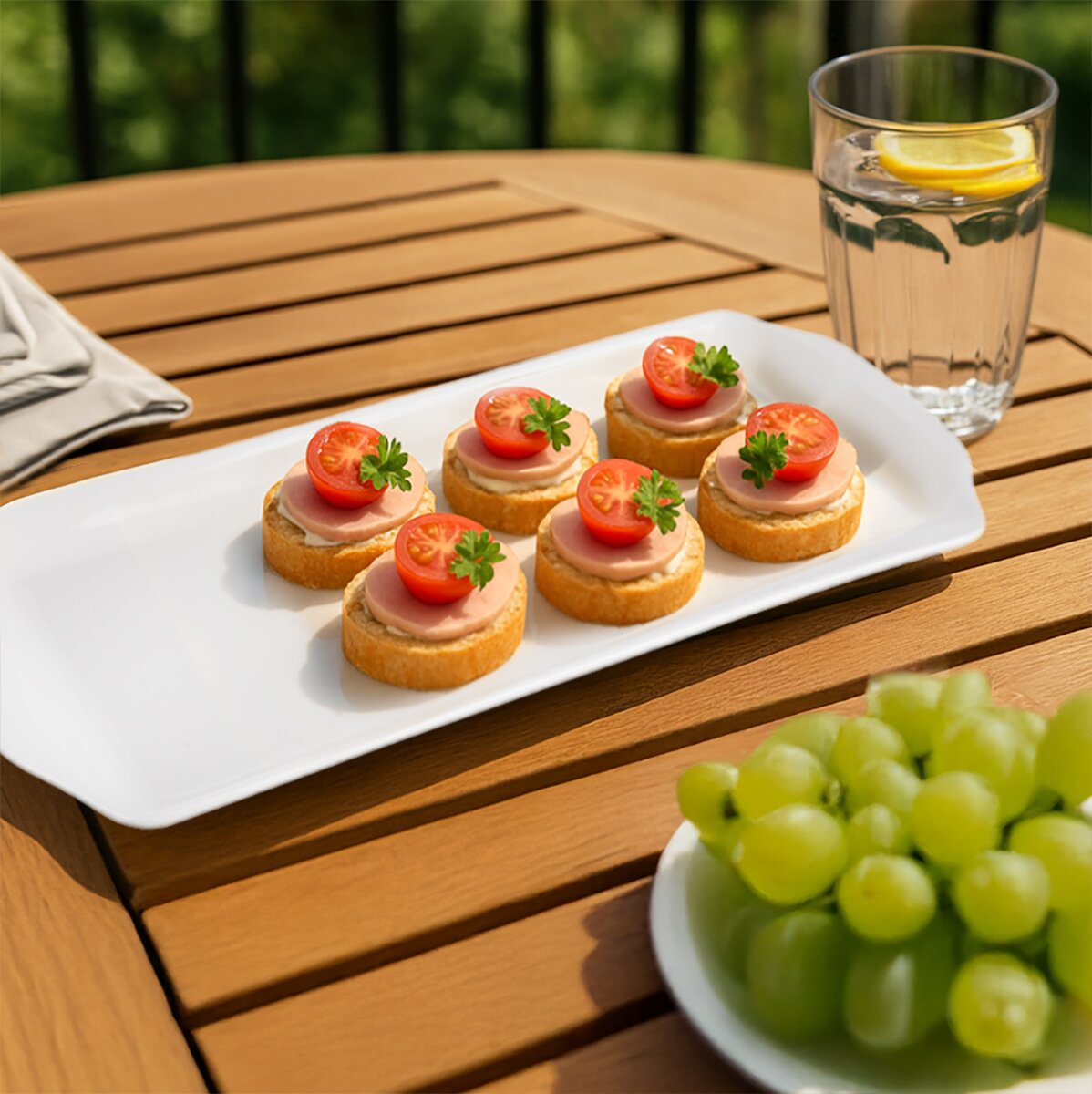 Více informacíKaždý se na oslavě nebo párty těší na klasické obložené chlebíčky, kanapky, drobné zákusky nebo mix sýrů, salámů a zeleniny. A aby bylo servírování opravdu stylové, tyhle dobroty můžete naaranžovat na jednoduchý bílý tác. Má nadčasový obdélníkový s lehce zvednutými okraji.