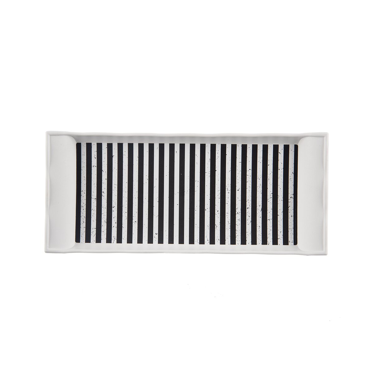 Servírovací tác je šikovným pomocníkem k přenášení, podávání kávy, čaje nebo drobného občerstvení. Snadno díky jeho zvednutým bokům, které jsou navíc ze spodní části opatřeny drobnými vroubky, přenesete dva hrnečky s cappuccinem nebo limonádu. Dekor černobílých pruhů zaujme nejen milovníky těchto barev v interiéru.