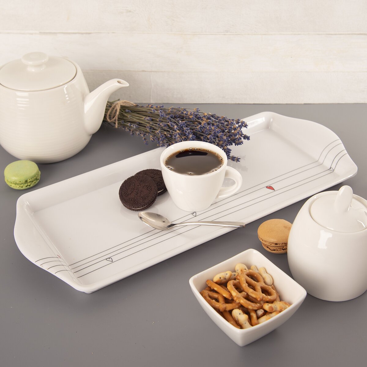 Můžete na něm podávat různé moučníky a slané pochutiny v miskách nebo na talířcích, ale samozřejmě i přenášet kávu a jiné nápoje partnerovi nebo vašim hostům.