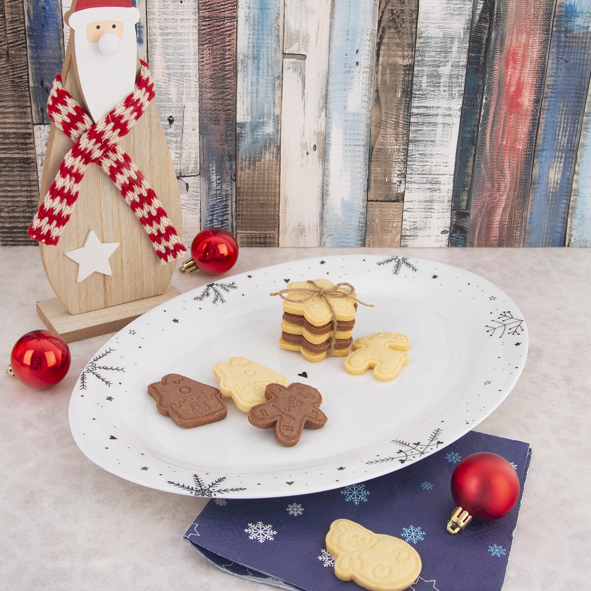 Krásně naservírované vánoční cukroví, dezerty, ale i chlebíčky nebo jednohubky budou skvělým pohoštěním pro rodinu nebo hosty. Krásný oválný talíř s originálním dekorem z dílny našich designérů je tím pravým kouskem.