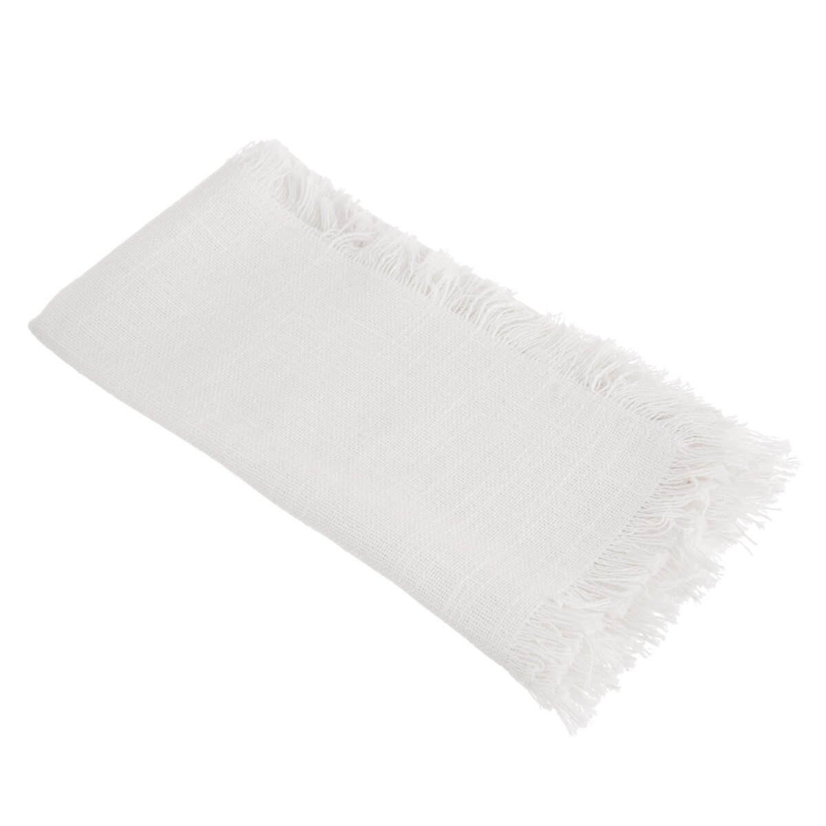 Tyto látkové ubrousky v nadčasovém bílém odstínu se hodí pro běžné i slavnostní prostírání. Mají jemnou strukturu a lem s třásněmi, lze je složit pod příbory nebo použít kroužky na ubrousky a položit je na položené talíře.