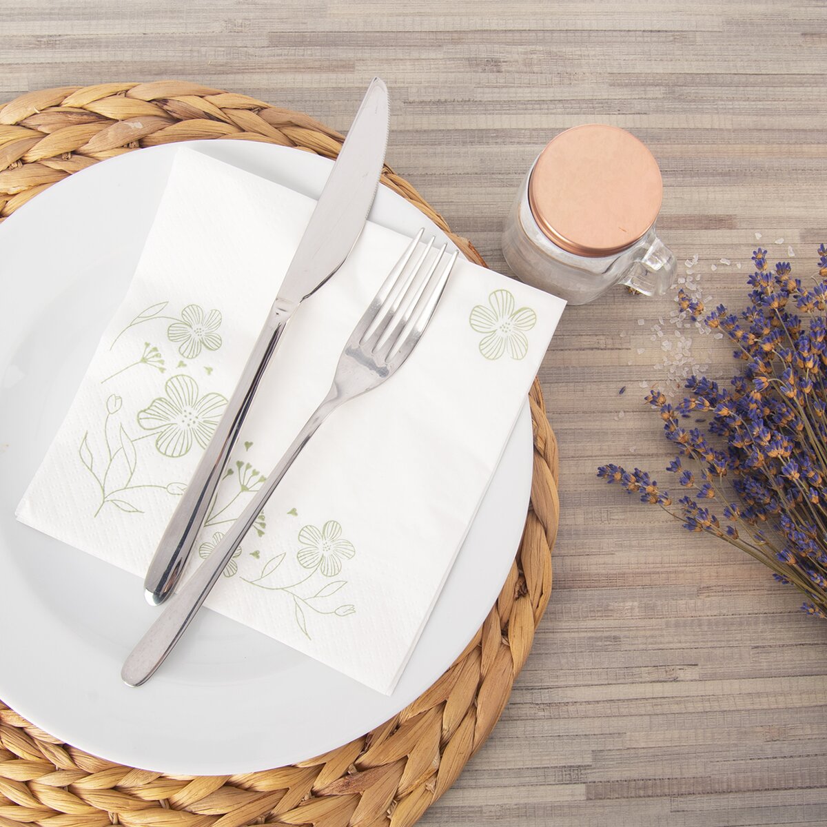 Decentní ubrousky jsou zdobeny jemným zeleným květinovým dekorem. Ten vznikl v dílně Orion designéru.
