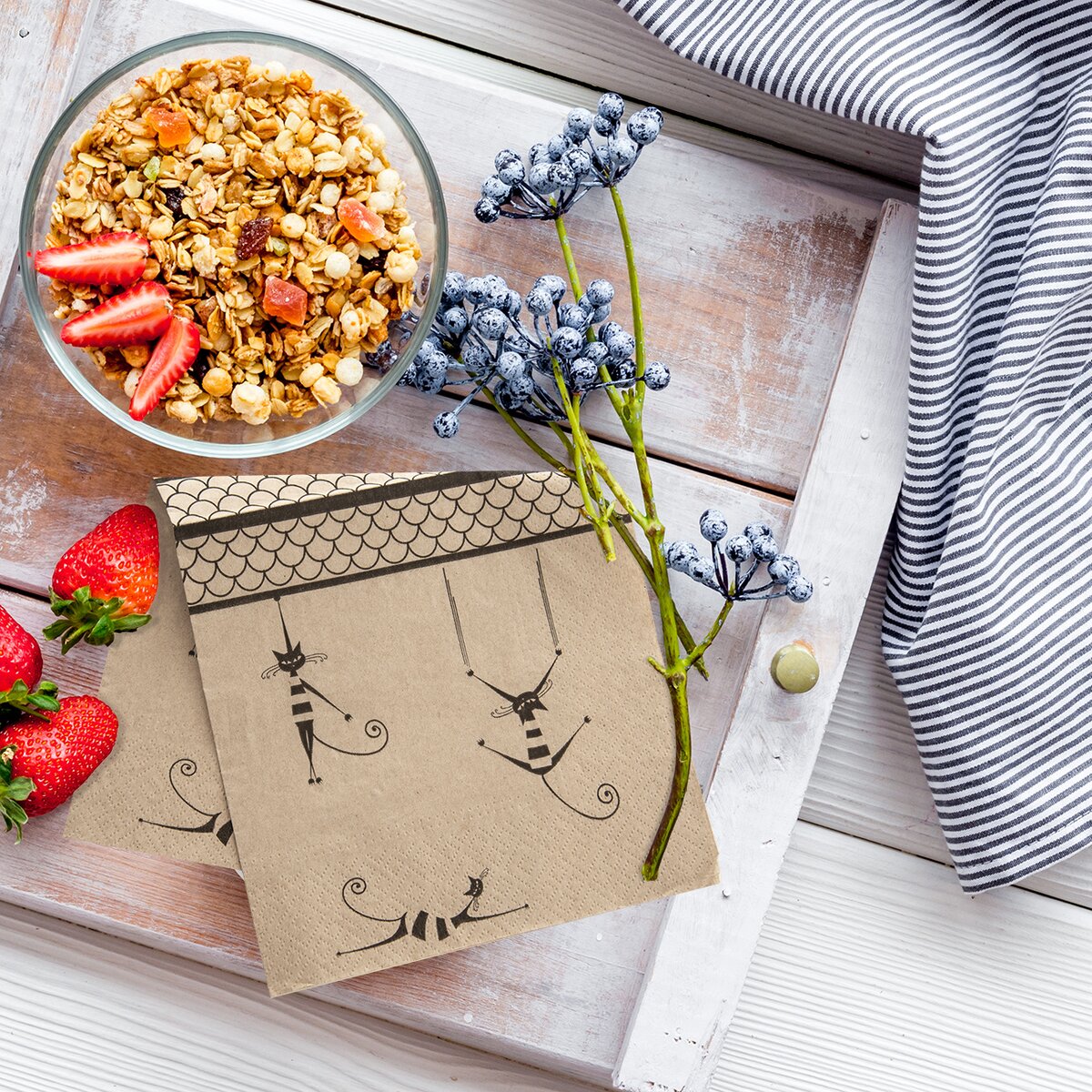 Zpříjemněte si stolování s krásnými papírovými ubrousky v rustikálním stylu, s oblíbeným motivem koček. Ať už si dáte práci a složíte jej, nebo ho jednoduše vložíte pod připravené příbory, bude se vyjímat při každé příležitosti. Ubrousky lze využít i pro ubrouskovou techniku.