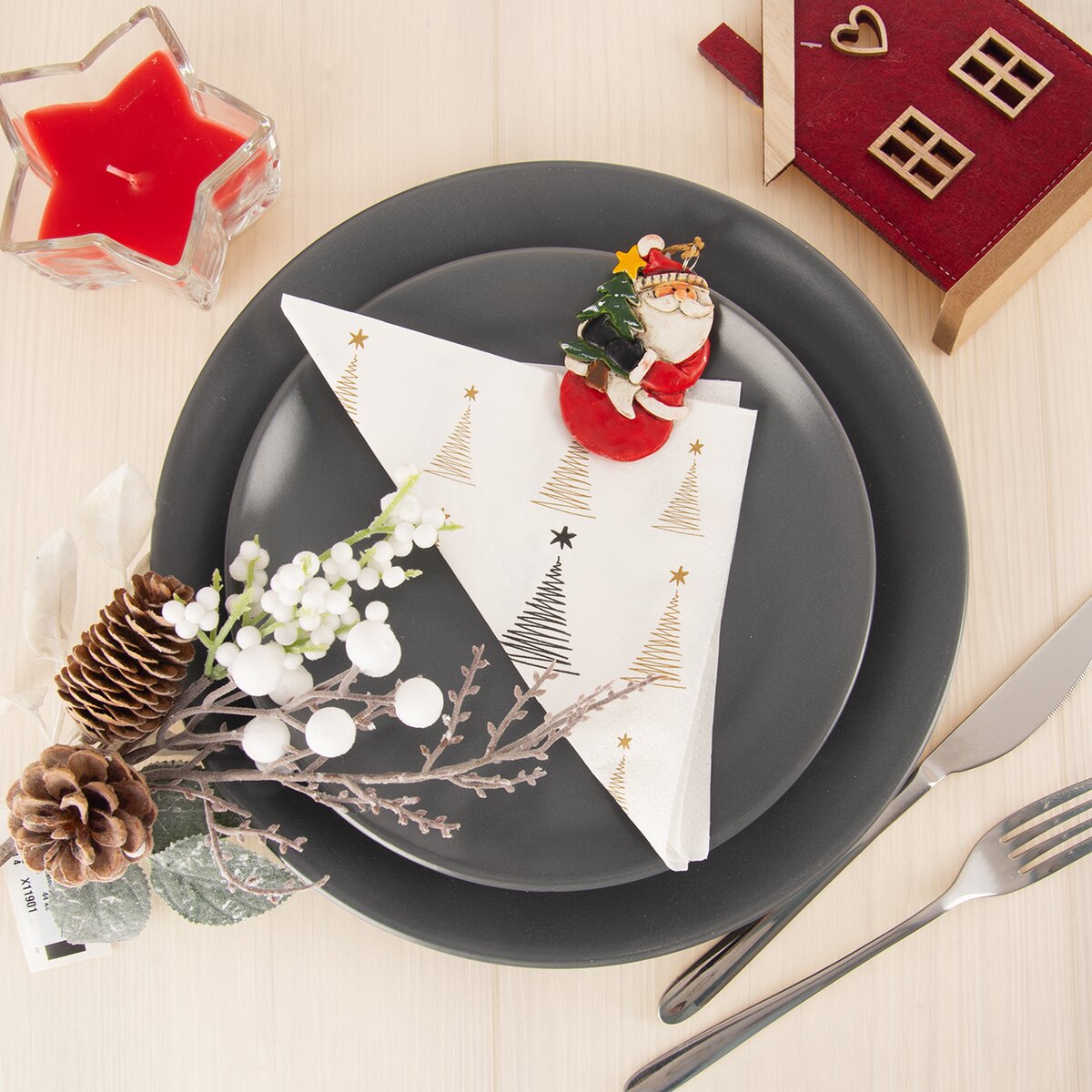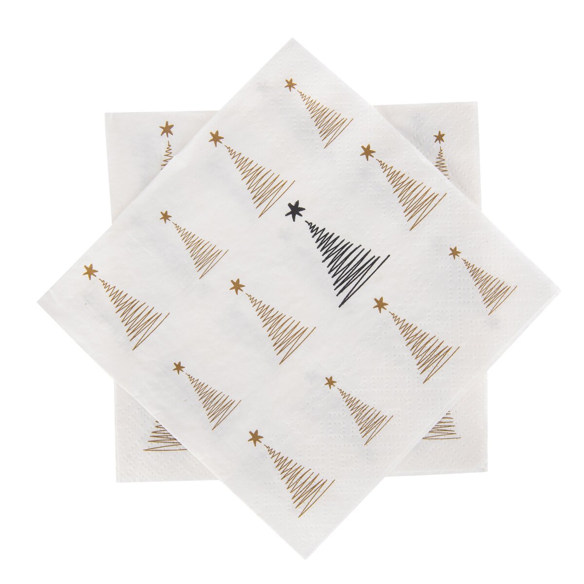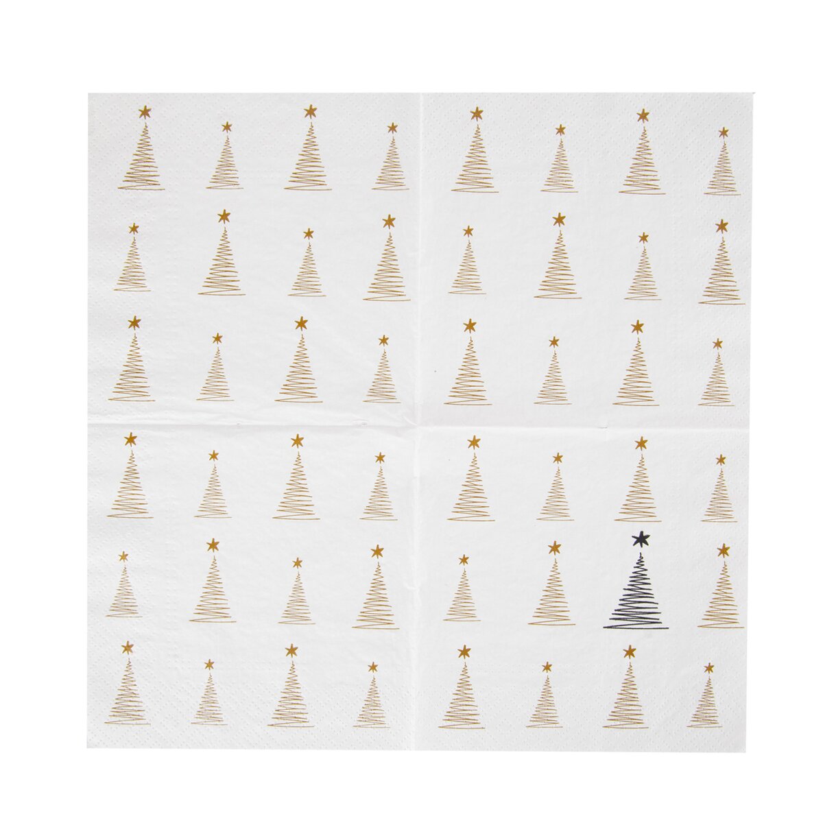 Kód produktu 842316Sada 20 ks bílých papírových ubrousků o rozměru 33x33 cm, potištěných motivem zlatých vánočních stromků, z nichž jeden je v černé barvě, doplní decentně prostřenou slavnostní tabuli.