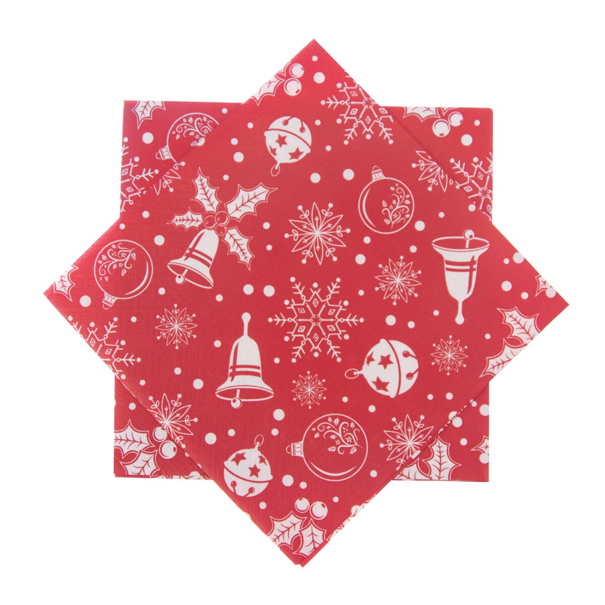 Kód produktu 842307Sada 20 ks červených papírových ubrousků s motivem vloček, rohliček a zvonků, o velikosti 33x33 cm, doplní prostřený stůl o vánočních svátcích i v období Adventu.