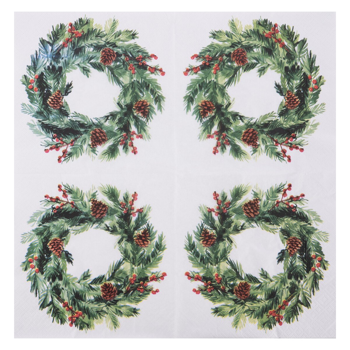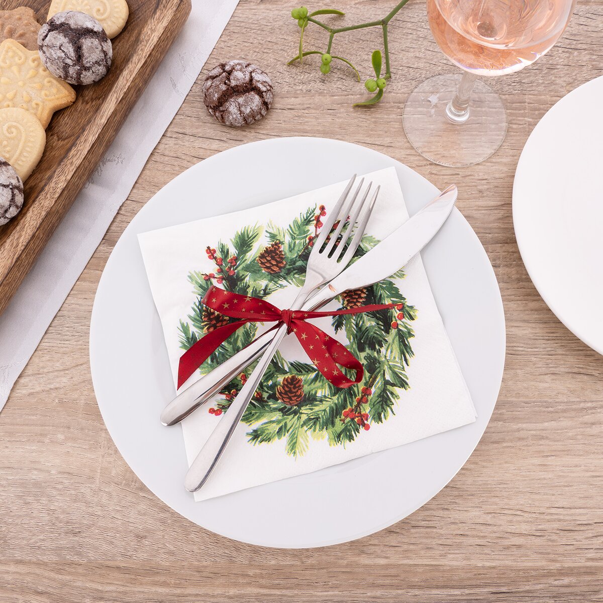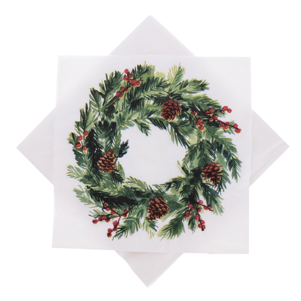 Kód produktu 842370Sada 20 ks světlých papírových ubrousků je zdobena motivem věnce. Ubrousky mají velikost 33x33 cm a doplní prostřený stůl o vánočních svátcích i v období Adventu.