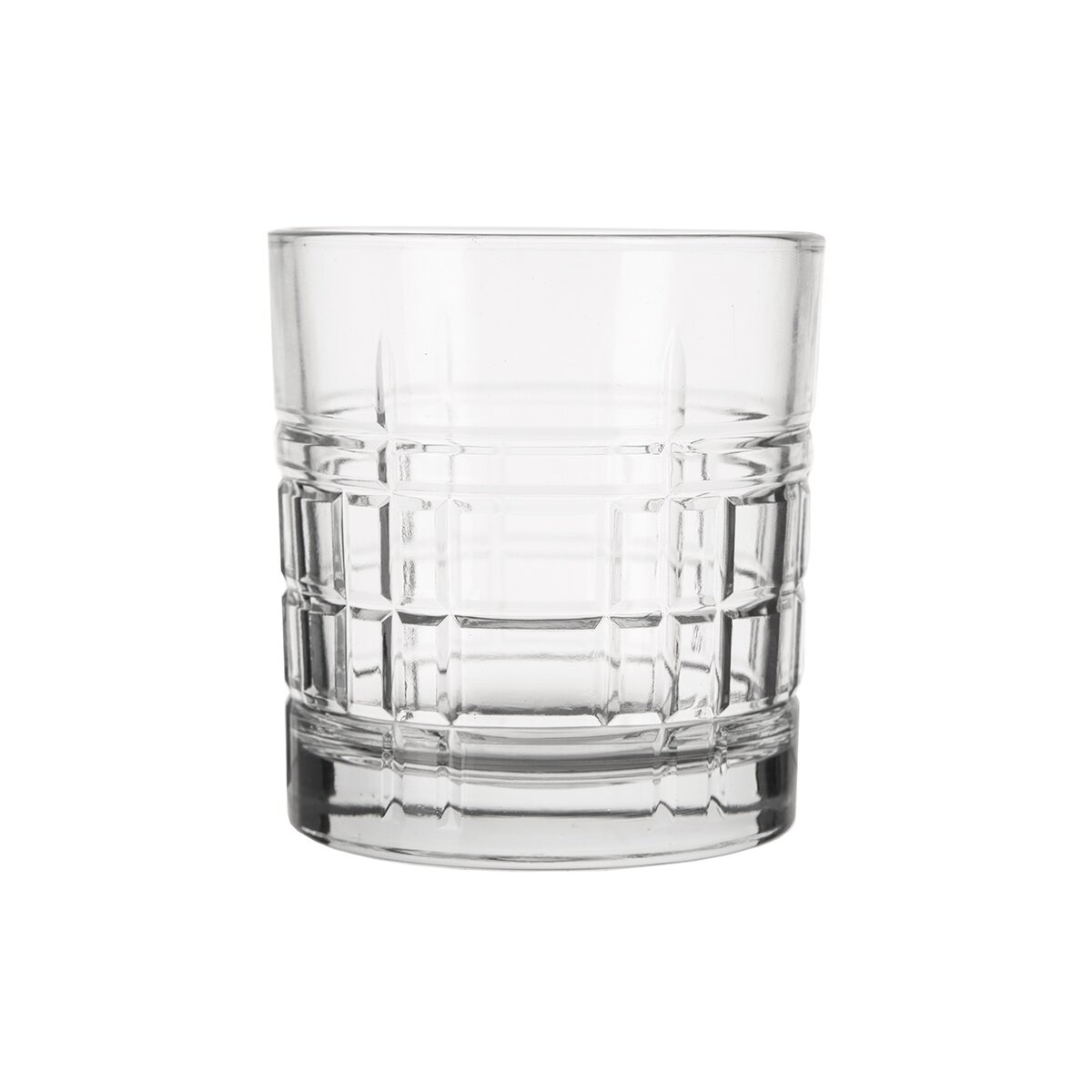 Křížení svislých a vodorovných čar zdobí reliéf na těchto sklenicích, určených k univerzálnímu použítí. Jejich dekor odkazuje k tradici masivného skla s výrazným výbrusem, které se často používá nejen v hotelových lobby barech, např. k podávání whisky s ledem.