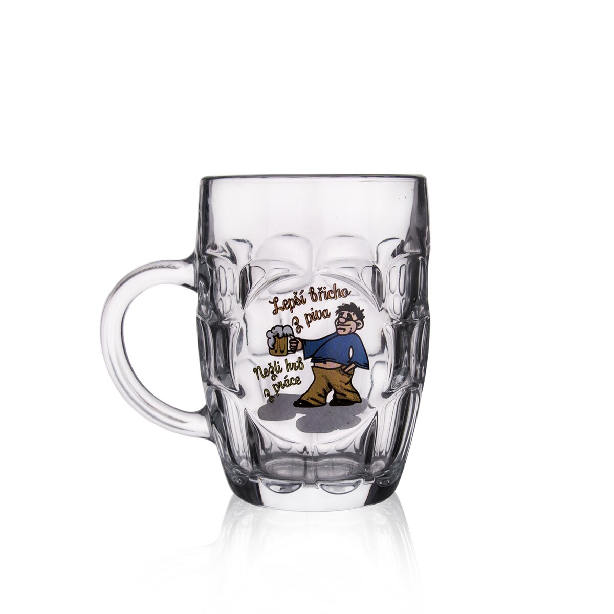 Sklenice na pivo s vtipným dekorem. Materiál: sklo. Rozměry: 0,5 l, pr. 9,5 cm, v. 14 cm.