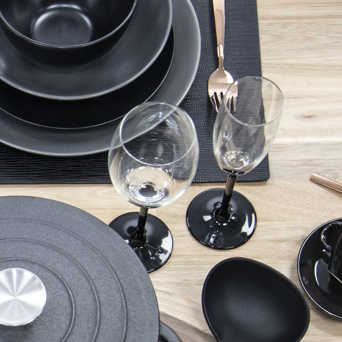 Nožka sklenice je vyrobená z černého skla, díky čemuž vynikne na každém stole.