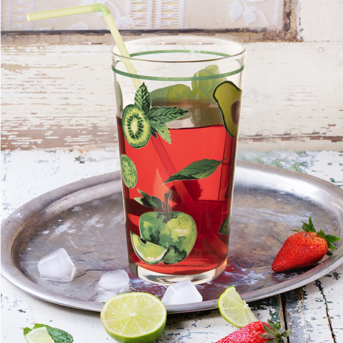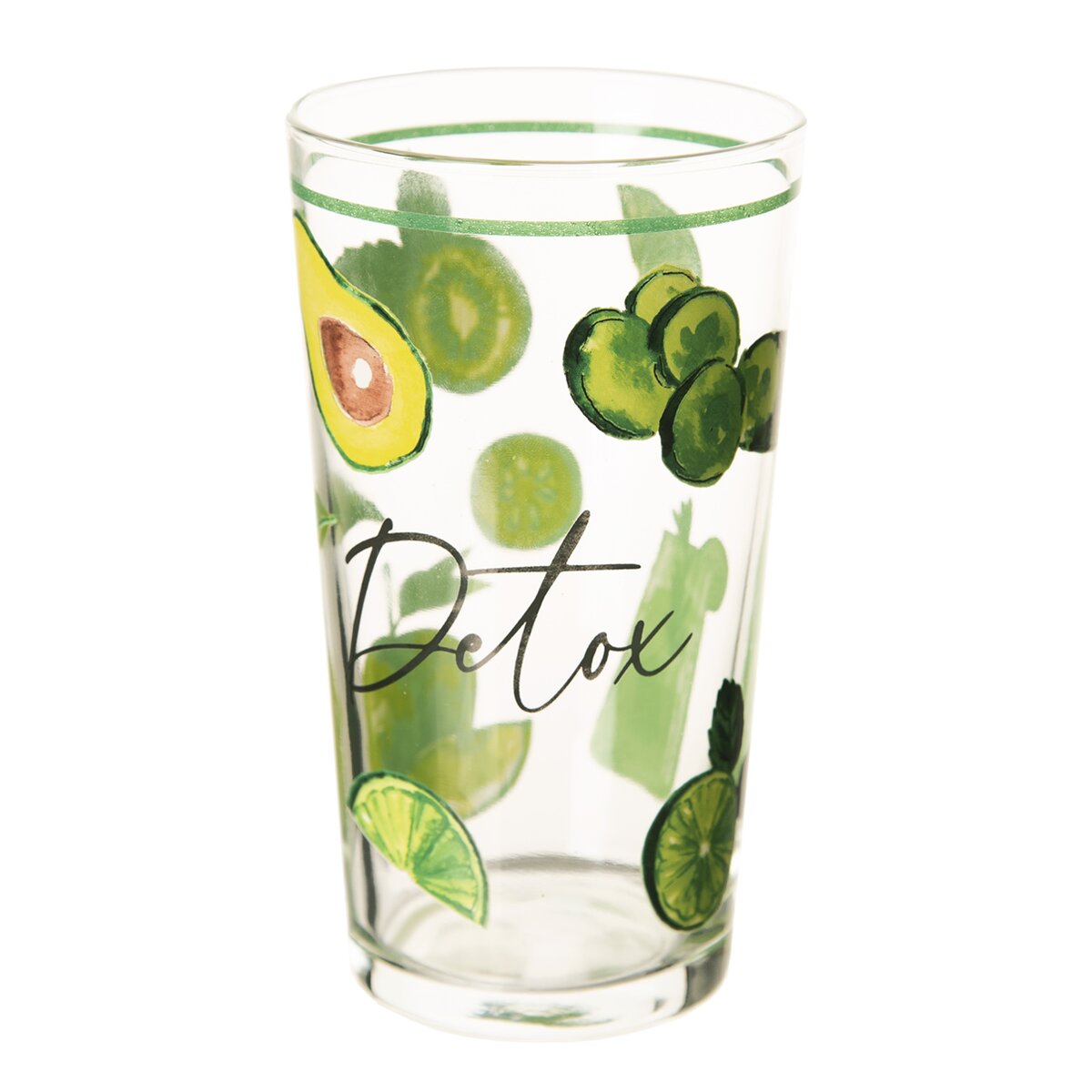 Kód produktu 129316Sklenice o objemu 0,6 l s barevným dekorem zelených jablek, kiwi, avokáda a okurků, vhodná nejen na letní nápoje a minerálky.