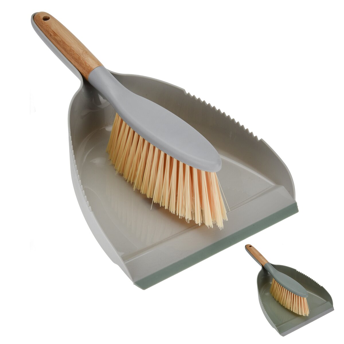 Kód produktu 711910Plastová lopatka s gumovým okrajem a smetáček s rukojetí z bambusového dřeva.