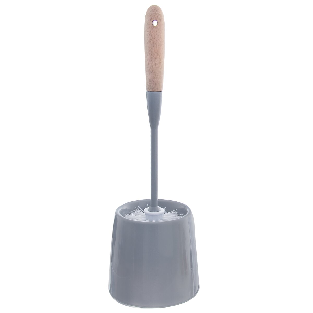 Kód produktu 540657Souprava na WC s nádobkou a štětkou výšky 40 cm, kombinující šedý plast a bambusové dřevo, je určená k pohodlnému čištění toalety.