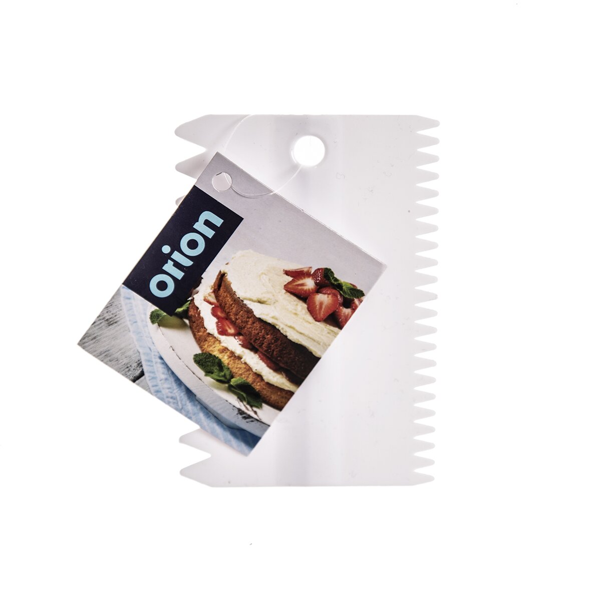 Kód produktu 142831Obdélníková plastová stěrka velikosti 11x7,5 cm s dvěma typy zubatých okrajů, vhodná pro zdobení krémů, polev nebo čokolády na koláčích i dortech.