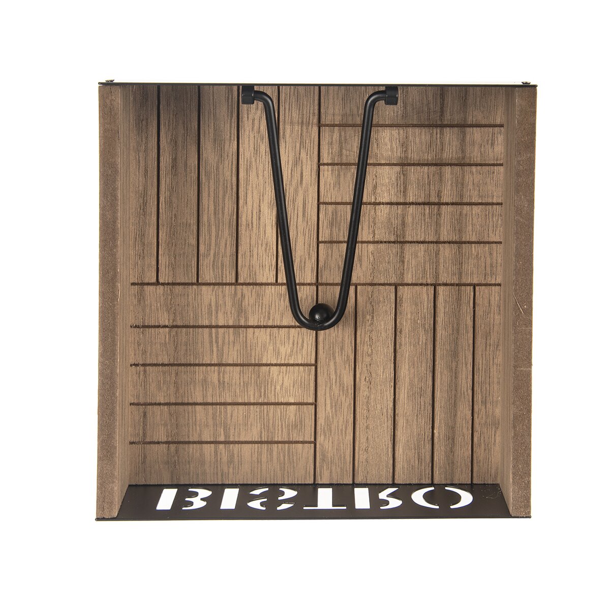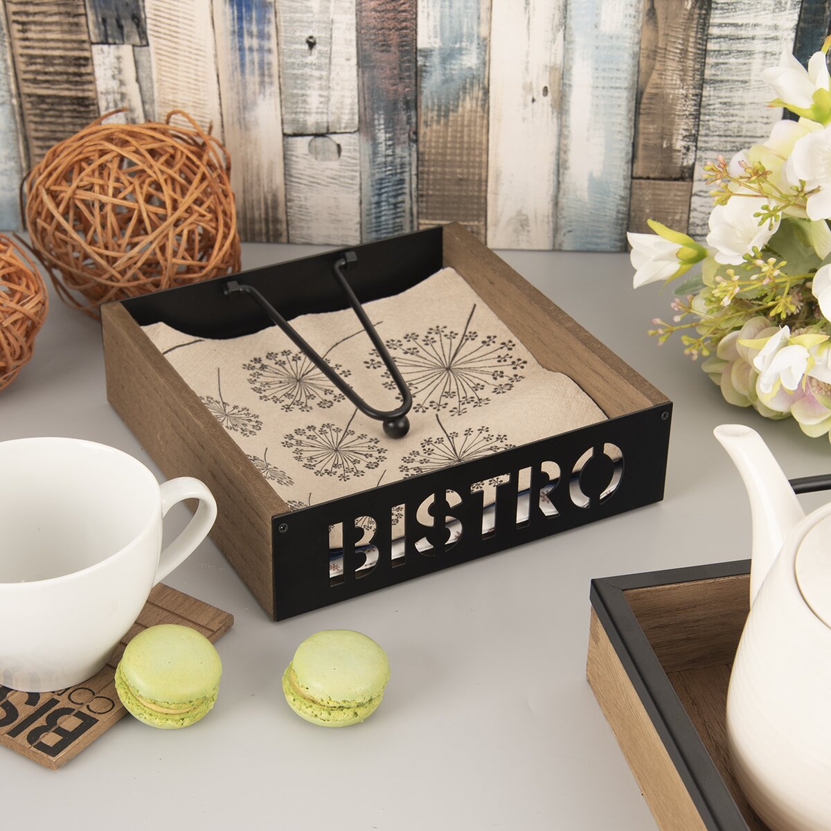 Kód produktu 122996Dekorativní stojan BISTRO na ubrousky pro domácí i venkovní stolování je vyroben z dřevovláknité desky a kovových prvků s černým nástřikem. Díky pohyblivé kovové záklopce udrží ubrousky na místě i při větrném počasí.