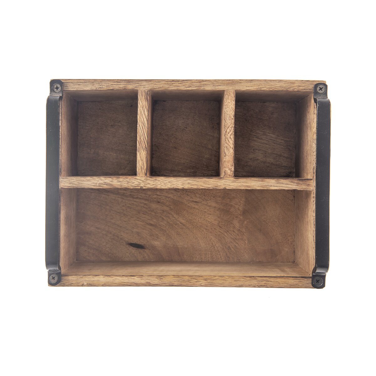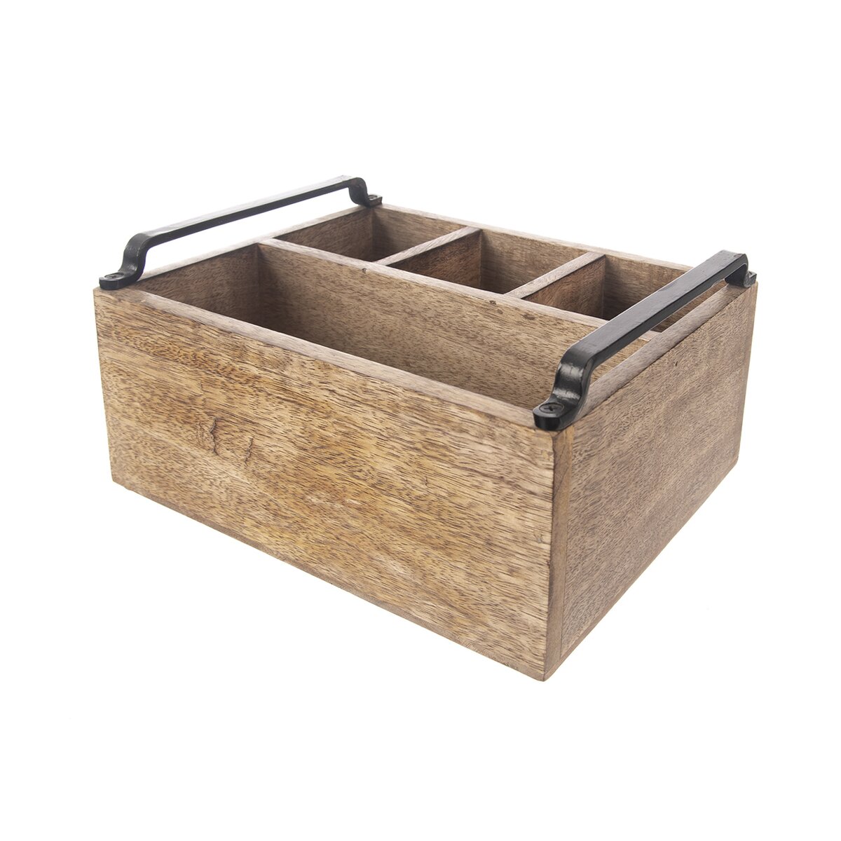 Kód produktu 154304Stojan na dochucovadla z mangového dřeva s kovovými úchyty. Je rozdělen na 4 sekce, kam lze vložit dochucovadla, příbory, kořenky i ubrousky.
