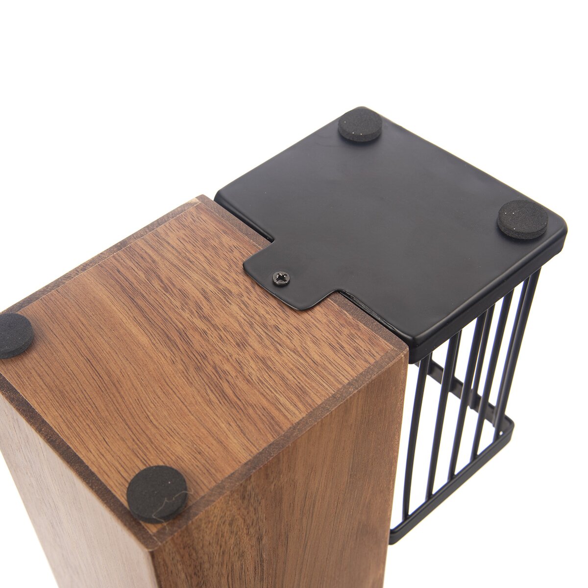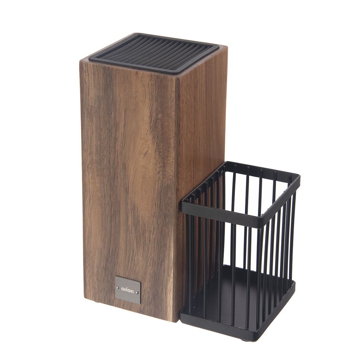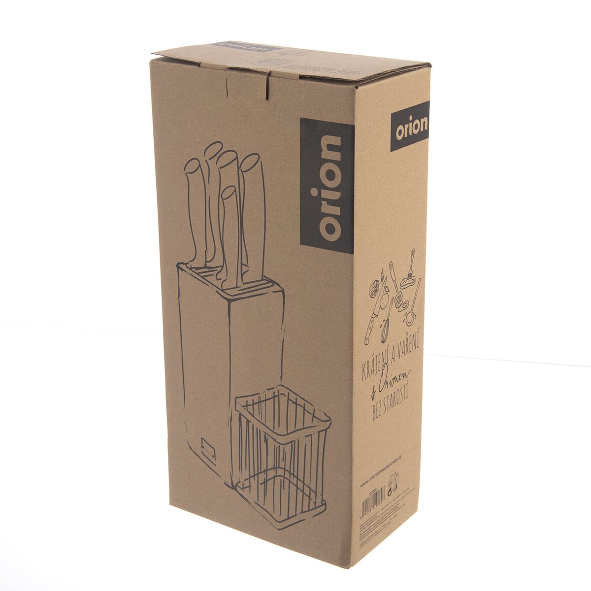 Kód produktu 122999Sada 5 kusů kuchyňských nožů s nerezovou čepelí, uložených v akáciovém stojanu s vkladem se štěrbinami. Stojan je doplněn kovovým postranním košíkem, vhodným k uložení různého kuchyňského náčiní.