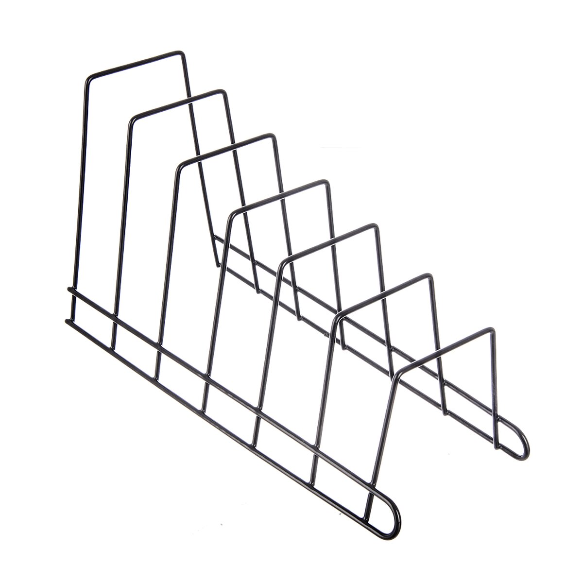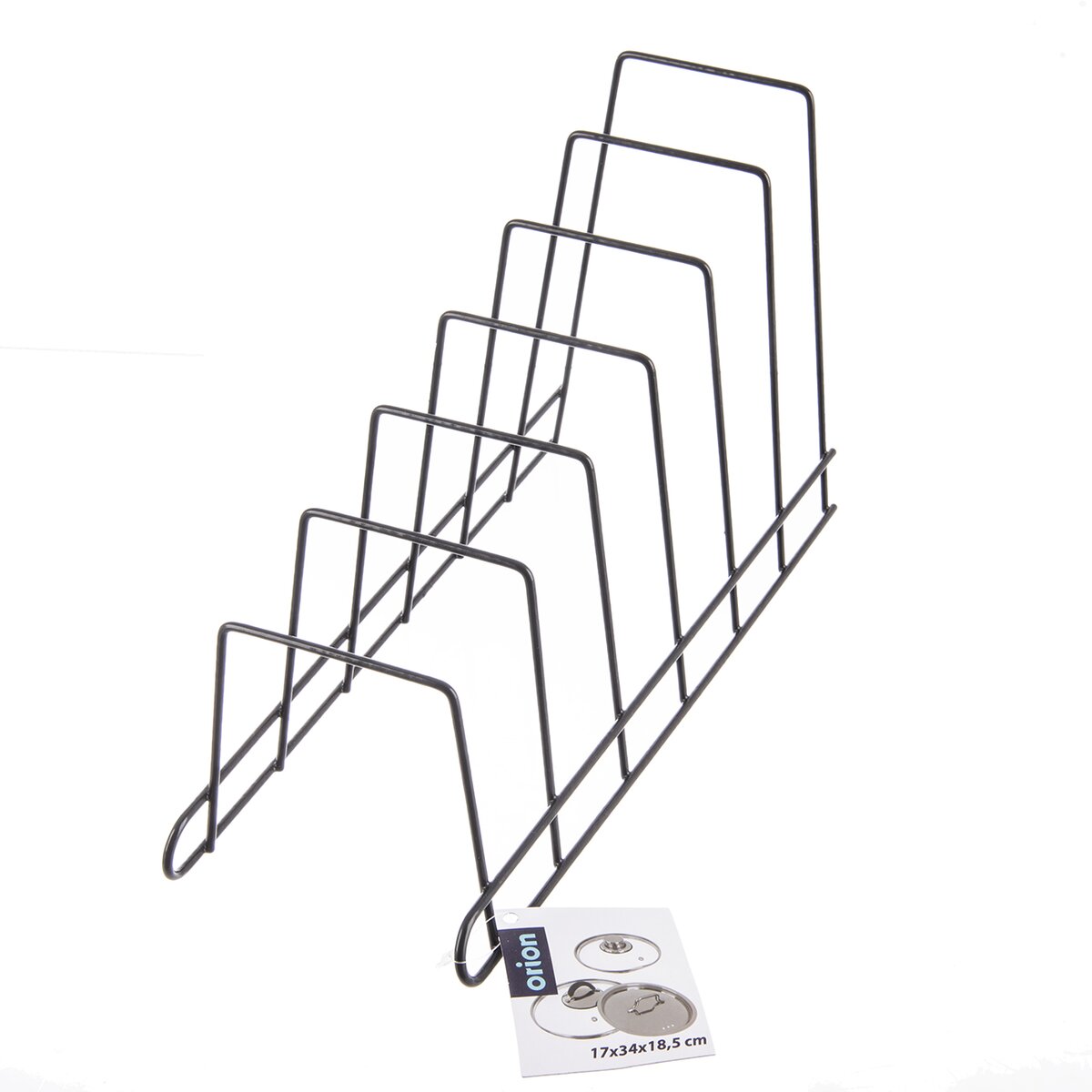 Praktický drátěný stojan s plastovou povrchovou úpravou zajistí bezpečné i přehledné uložení až 6 kusů nerezových, smaltovaných nebo skleněných poklic. Případně jej lze využít k uspořádání krájecích prkének nebo podložek pod hrnce.