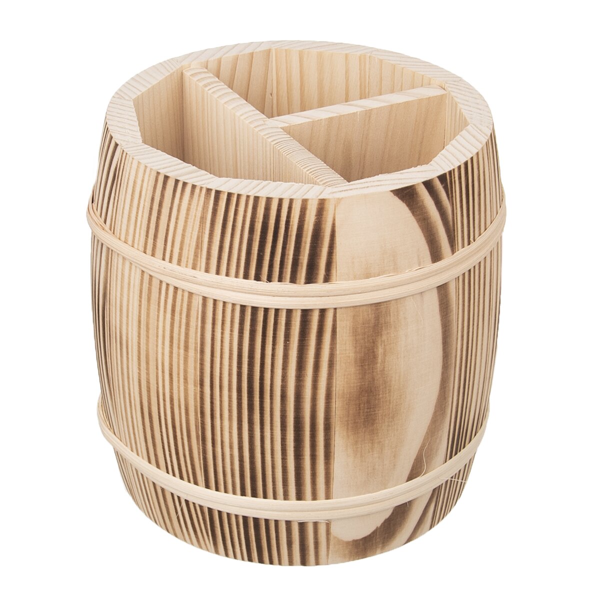 Praktický, ale i stylově vypadající stojan na příbory soudkového tvaru se třemi komorami bude zajímavým kouskem při stolování na terase, zahradě i chalupě s dobrým jídlem a pitím. A abyste měli steakové nože, vidličky po ruce při grilování, stačí je vložit do stojanu a hostina pod širým nebem může začít.