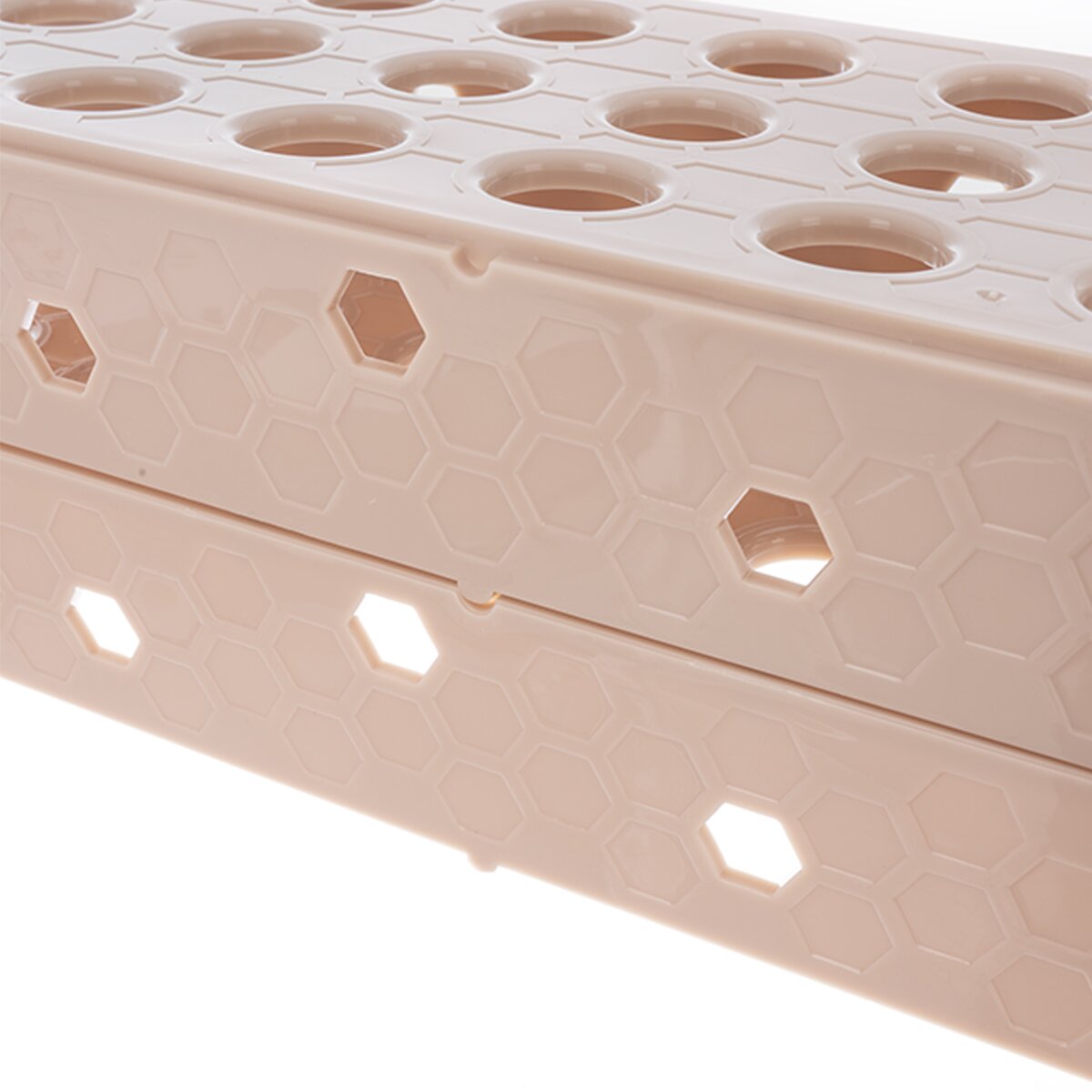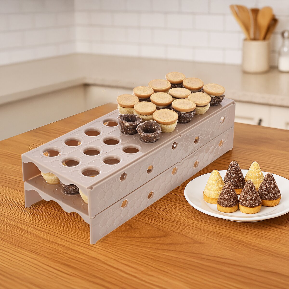 Stojan má 24 otvorů a je stohovatelný – lze jej skládat do více pater nad sebe, což šetří místo při přípravě i skladování. Stojan je vyroben z kvalitního plastu PP vhodný do myčky nádobí a mrazáku.
