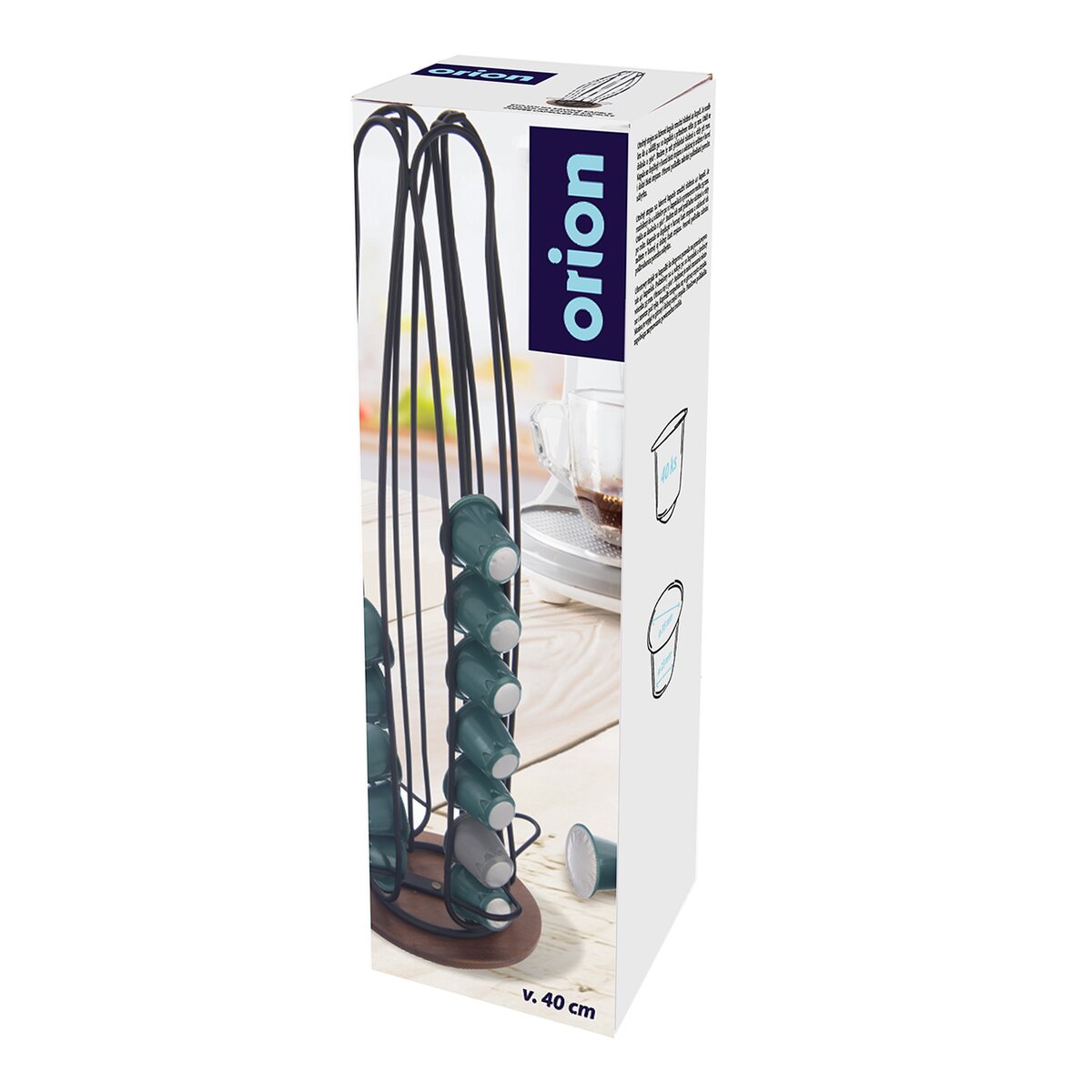 Více informacíŽelezný stojan s černým nástřikem je určen k praktickému uložení klasických kávových kapslí (pr. víčka 35 mm, pr. dna 23 mm, výška 27 mm), které lze libovolně v horní části nasunout do 4 sekcí, tedy do každého oddílu po 10 kapslích.