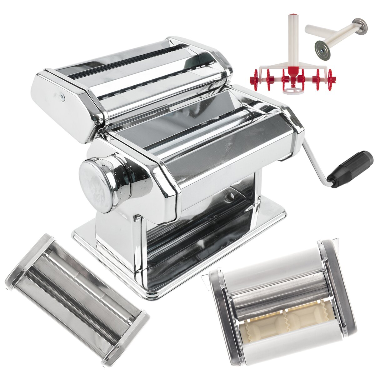 Kód produktu 131512Nerezový strojek FRANCESCO se 3 nástavci a 2 šikovnými rádélky. Je ideální na výrobu domácích těstovin, vlasových, polévkových nudlí, špaget, širokých nudlí, plněných raviol i lasagní.