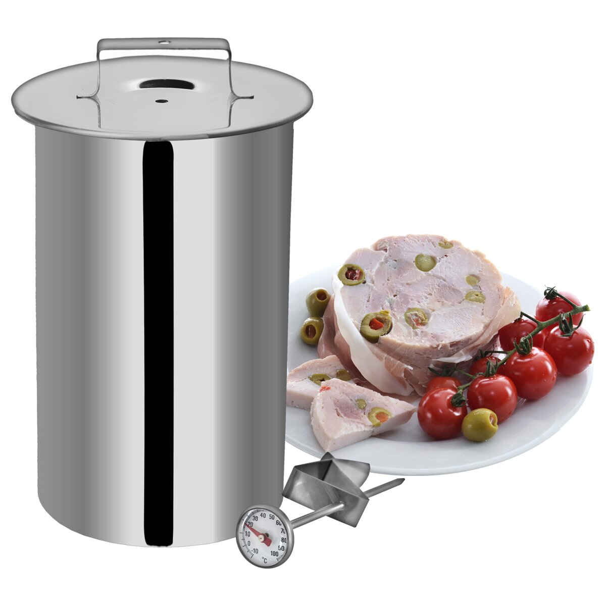 Kód produktu 131514Nerezový hrnec na výrobu domácí šunky nebo paštiky s teploměrem a víčkem.