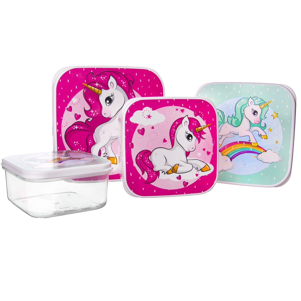 Kód produktu 154017Sada čtyř plastových svačinových boxů s víčkem v dekoru JEDNOROŽEC. Mají objemy 0,3 l, 0,45 l, 0,65 l a 1 l.