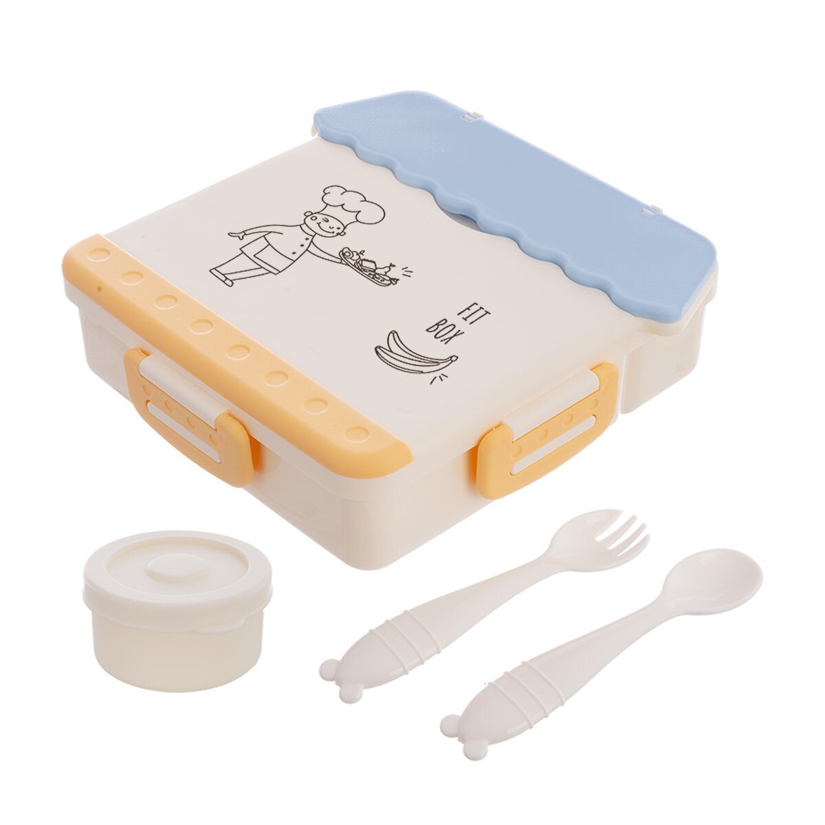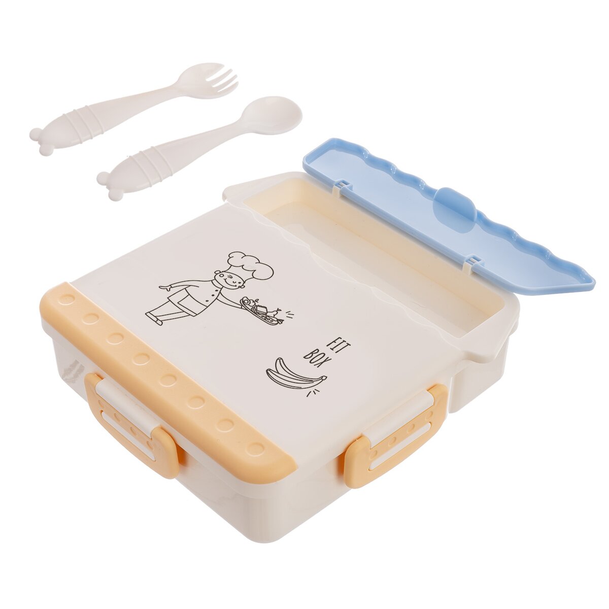 Kód produktu 154080Dětský svačinový box se čtyřmi přihrádkami, mističkou a příborem, s těsněním ve víčku a praktickým uchem. Designed by Orion.