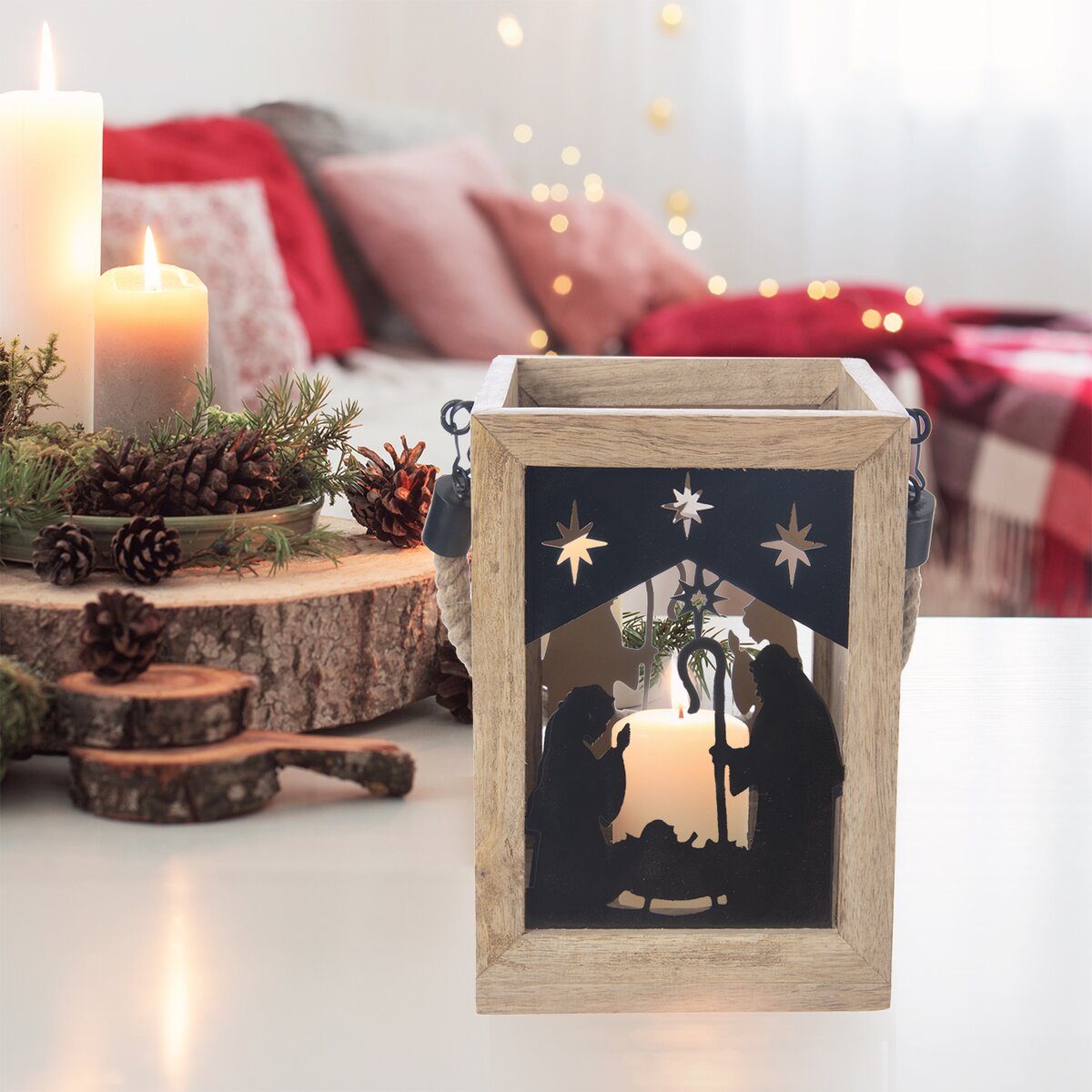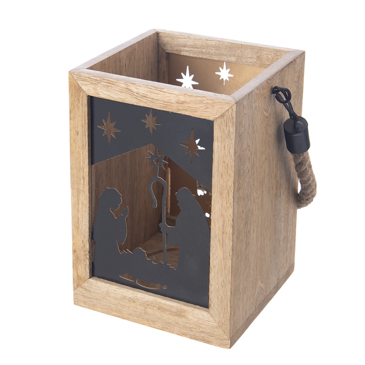 Kód produktu 351839Hranatý svícen s krásnou texturou mangového dřeva a černou kovovou siluetou z Betléma je vhodný jako dárek nebo z něho bude stylový kousek do interiéru. Lze jej zavěsit za jutové držadlo.
