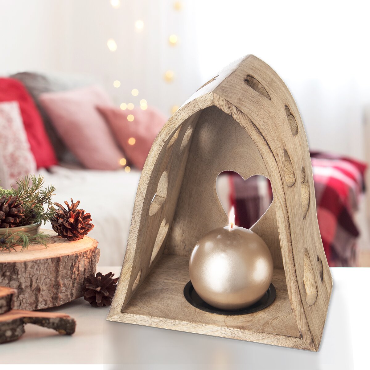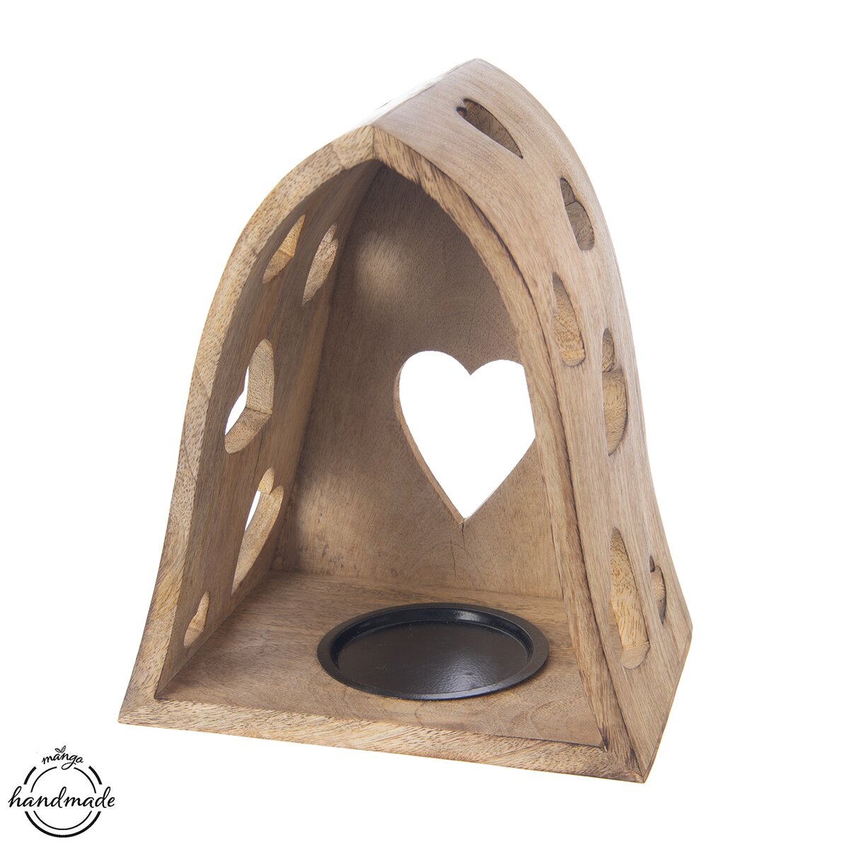 Více informacíKrásný svícen z mangového dřeva zdobí otvory ve tvaru srdcí. Evokuje lásku, spřízněné duše, něhu a navodí příjemnou atmosféru všude, kam jej postavíte. Zapálená svíčka uvnitř svícnu prosvětlí otvory ve tvaru srdíček a ty se pak promítají na stěnu nebo na strop.