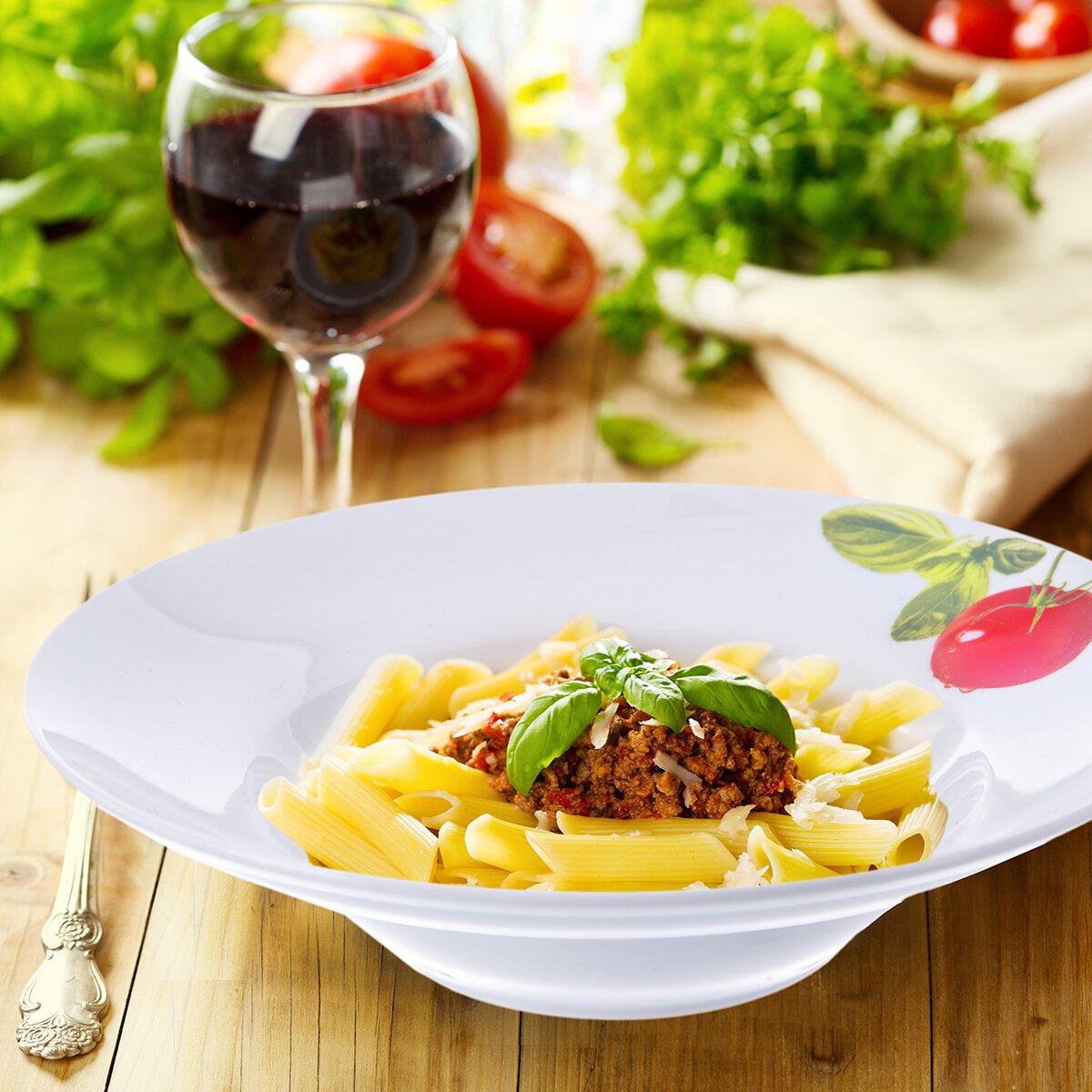 Talíř hluboký na těstoviny s drobným dekorem. Assort dekorů. Materiál: porcelán. Rozměry: pr. 27 cm, v. 6 cm.