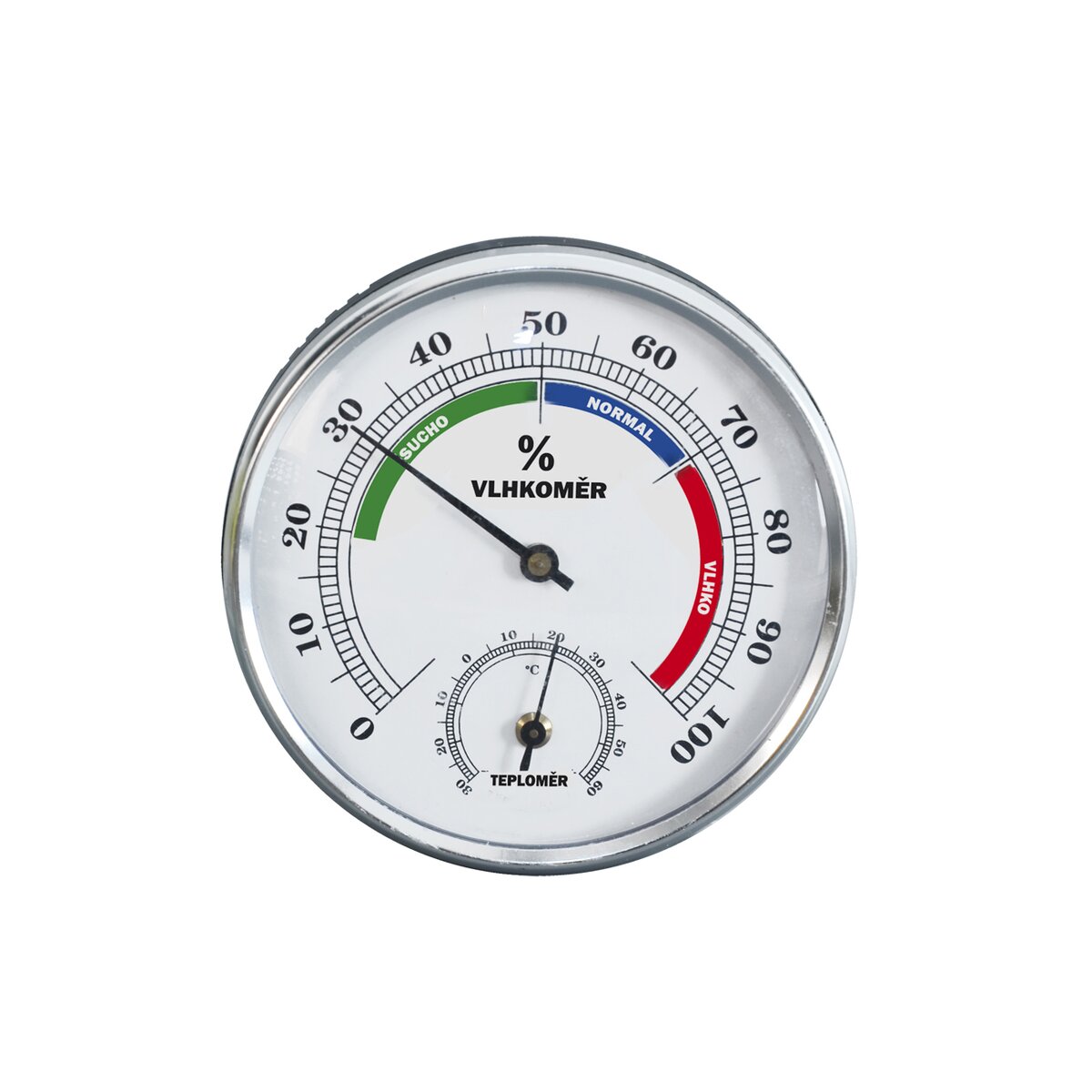 Kromě stupnice od - 30 °C do 60 °C má také vlhkoměr neboli hygrometr od 0 do 100 %. Teploměr umístěte tak, aby nebyl vystaven přímému slunečnímu záření, došlo by ke zkreslení hodnot.