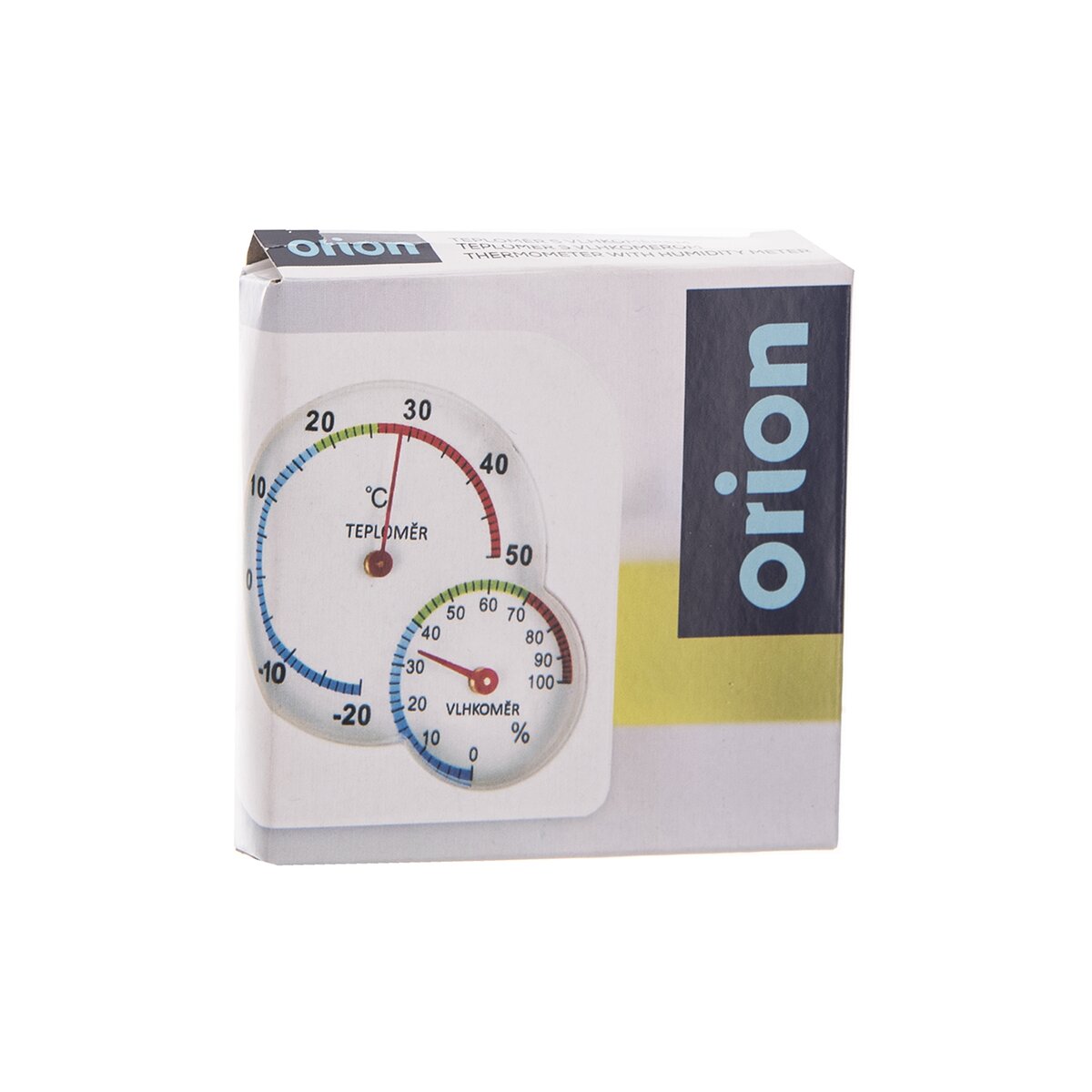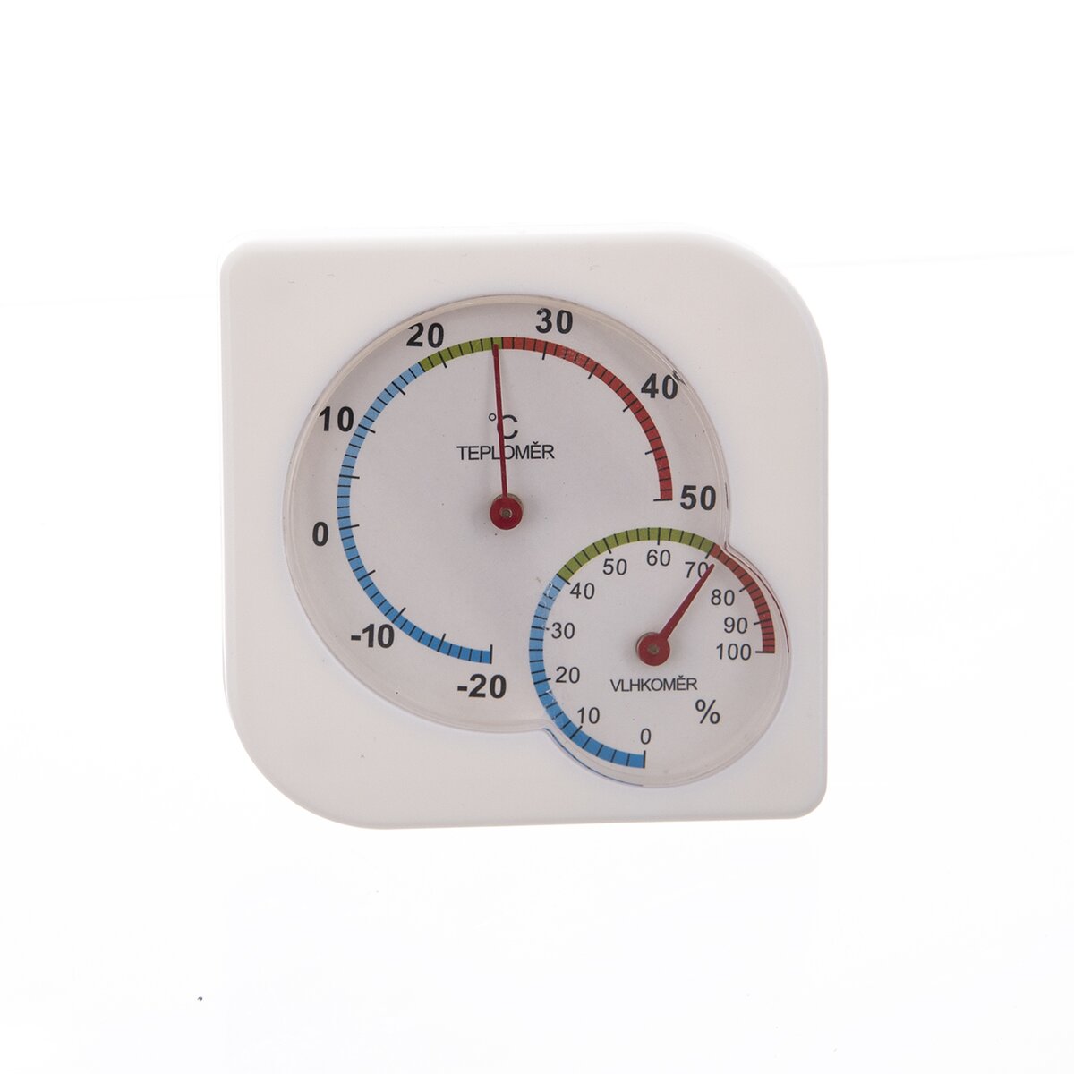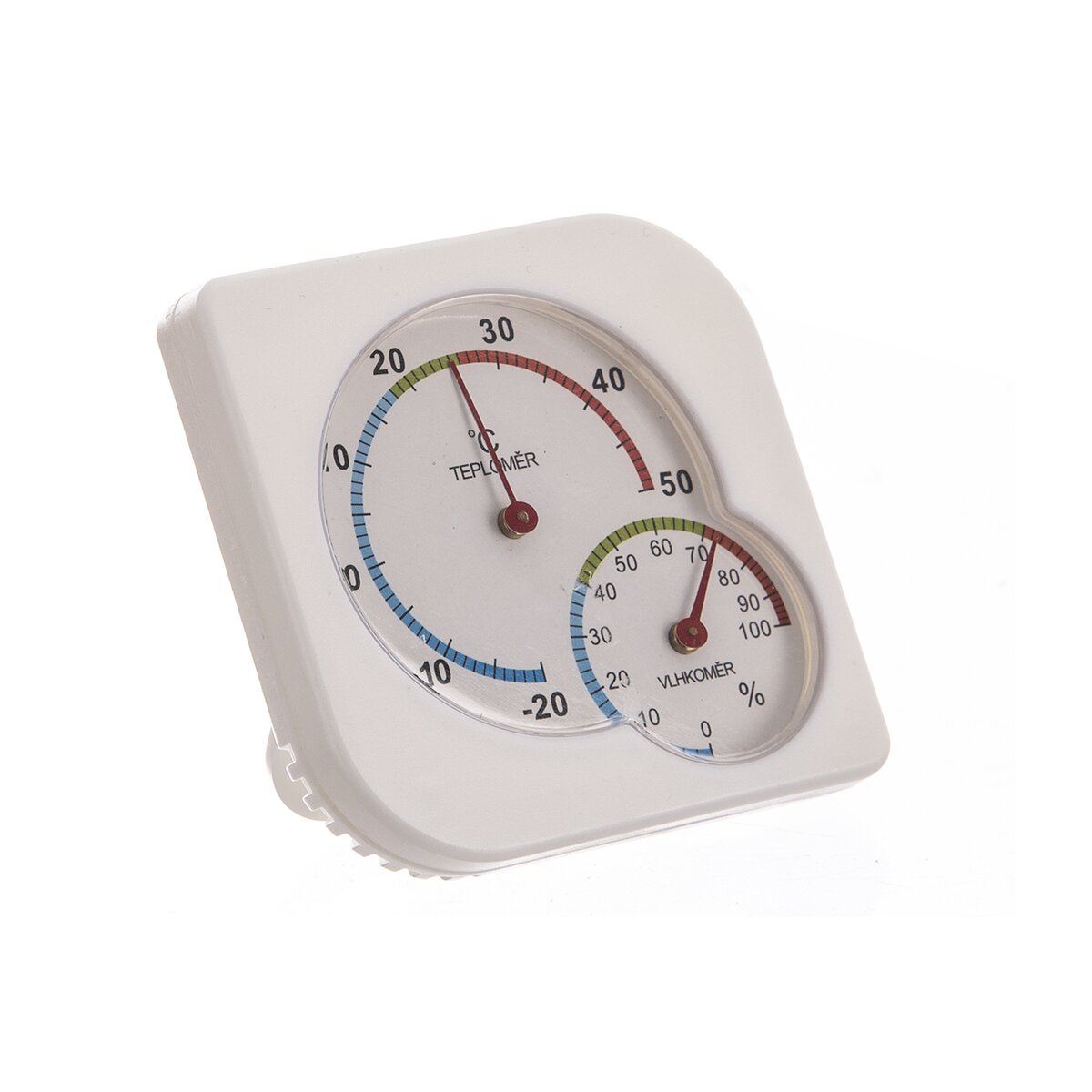 Tento mechanický venkovní teploměr má kromě stupnice v rozsahu od - 20 °C do 50 °C také vlhkoměr neboli hygrometr od 0 do 100 %.