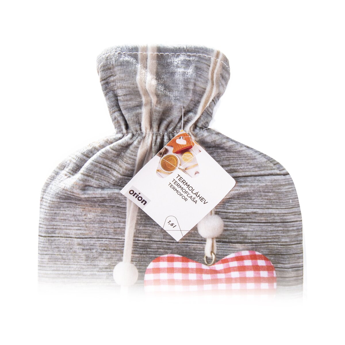 Tento termofor tvoří klasická gumová láhev se šroubovacím uzávěrem, vložená do stylového látkového obalu z polyesteru s vyobrazením srdce na dřevěném podkladu. Nádobu stačí vyndat a naplnit teplou vodou, která bude mít maximálně 40 °C. Samotný vak lze prát v pračce na 30 °C.