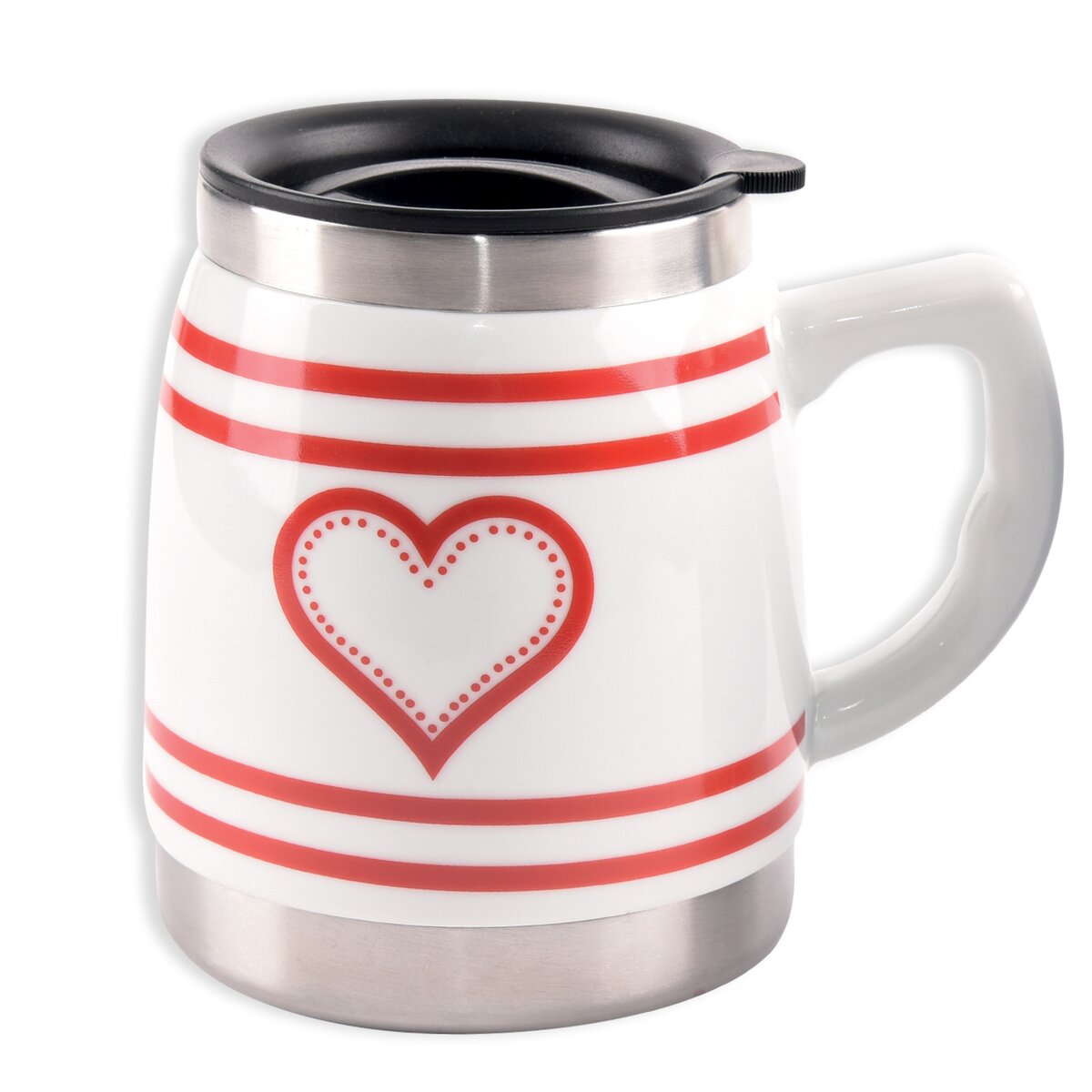 Kód produktu 112259Hrnek termo udrží Váš nápoj dlouho teplý nebo naopak chladný. Je praktický pro řidiče na cesty, ale i na běžné pití kávy, čaje. Plastové víčko se silikonovým těsněním, uzavíratelný otvor pro pití. Materiál: nerez, keramika, plast. Dekor SRDCE. Rozměry: objem 0,5 l, pr. 10,5 cm, v. 13 cm.
