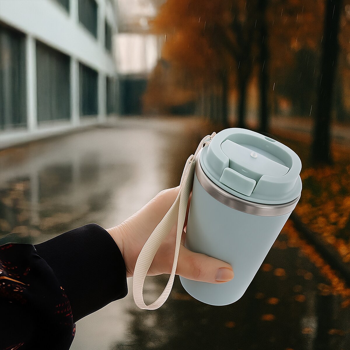 Stylový termohrnek s praktickým poutkem je ideální na cesty, do práce i pro sportovní aktivity.