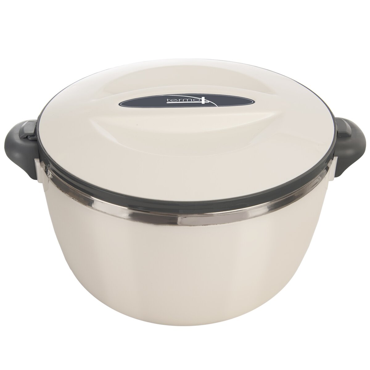 Kód produktu 128539Praktická bílá plastová termomísa TERMO má celkový objem 6 l. Je opatřena hladkým nerezovým vnitřkem a otočným termo víčkem. Slouží k uchování většího množství teplých nebo studených pokrmů.