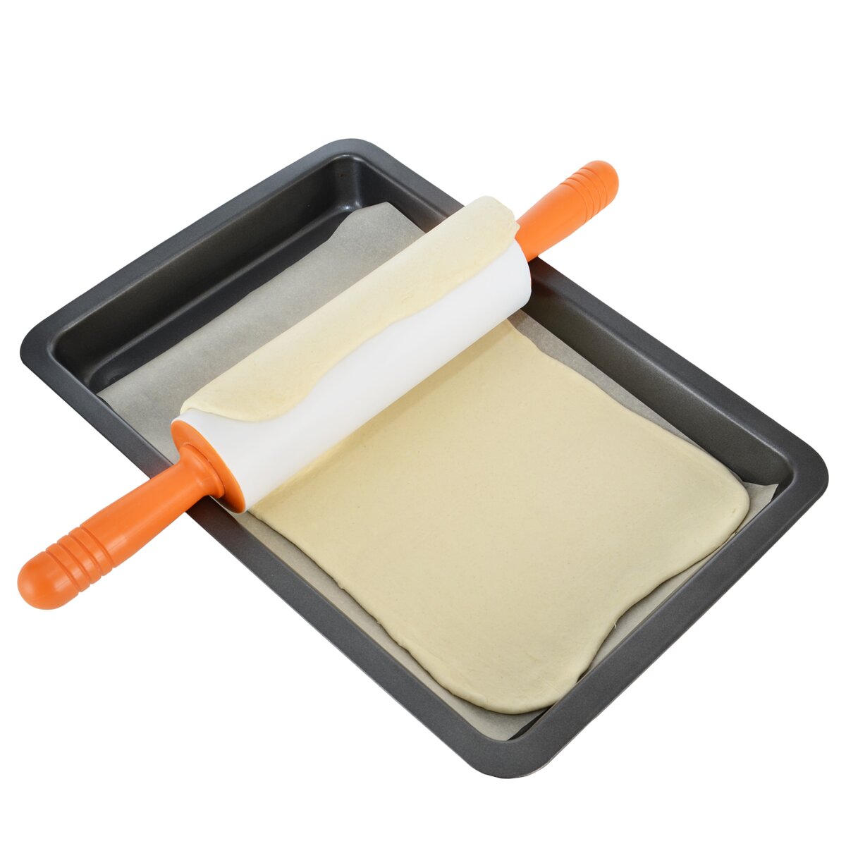 Pevný a přitom lehký váleček se silikonovým povrchem a oranžovými rukojeťmi je nepřilnavý, takže se na něho těsto téměř nelepí a výborně se s ním pracuje. Nebudete potřebovat tolik mouky při vyvalování těsta. Délka silikonové plochy je 23 cm. Silikon je odolný vůči teplotám -40 °C až +220 °C.