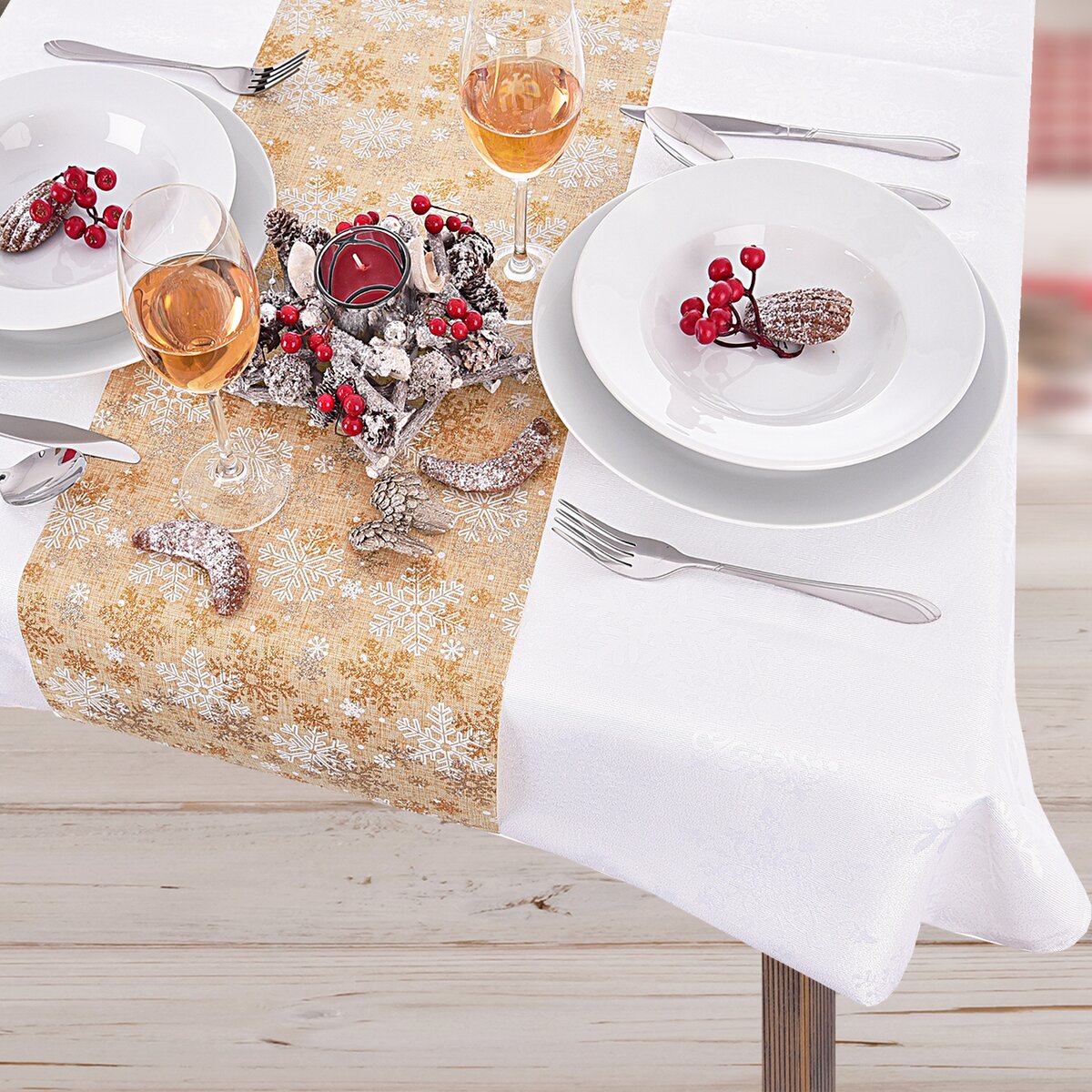 Jemný dekor vloček navíc tomuto svátečnímu ubrusu z polyesteru dodává ten správný finální dotyk. Je možné ho využít oboustranně.
